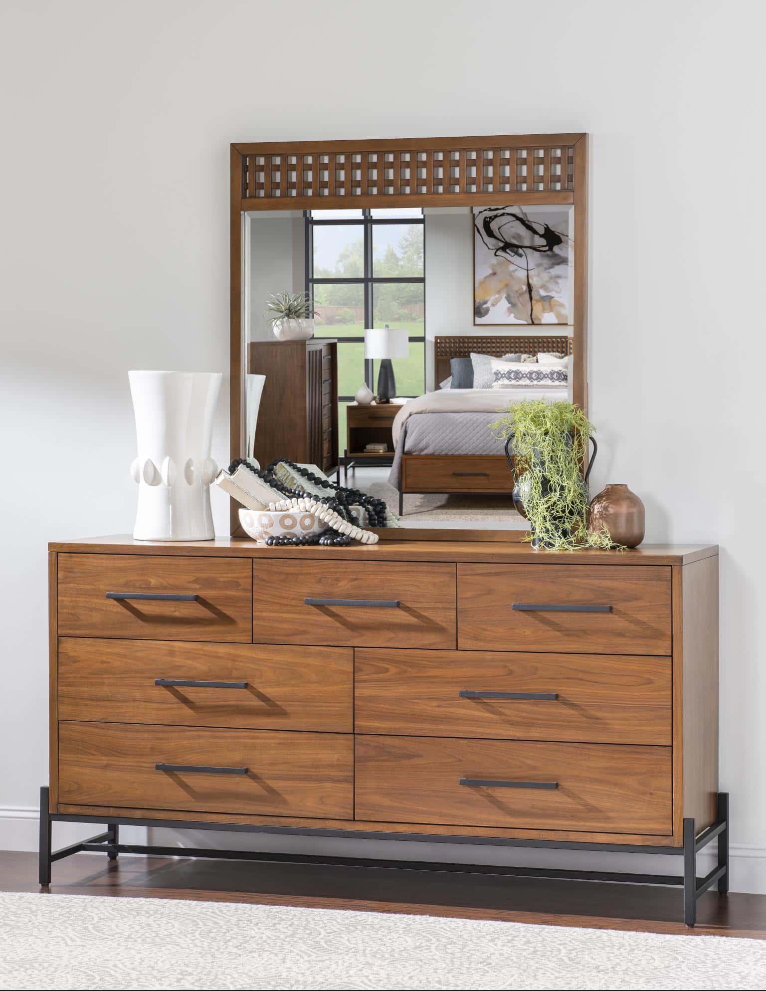 Product Description: 2172-1200 Dresser - Crafted of Select Hardwoods and Walnut Veneers. Mid-Century inspired with Basket Weave Accents. Matte Black Hardware.