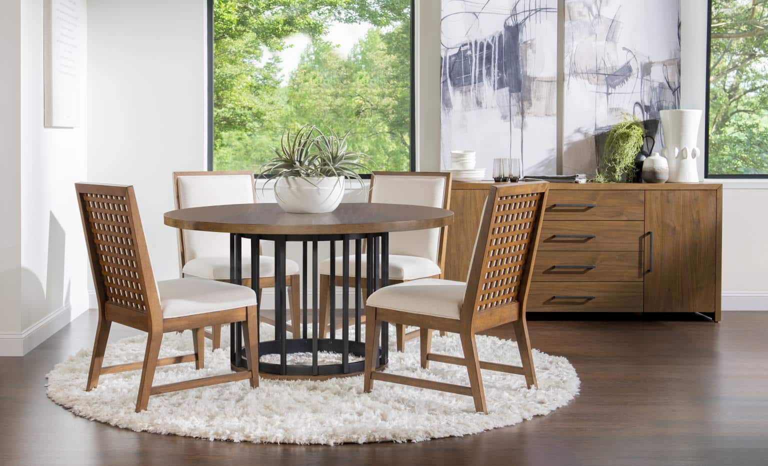 Product Description: 2172-151 Credenza - Crafted of Select Hardwoods and Walnut Veneers. Mid-Century inspired with Basket Weave Accents. Matte Black Hardware.