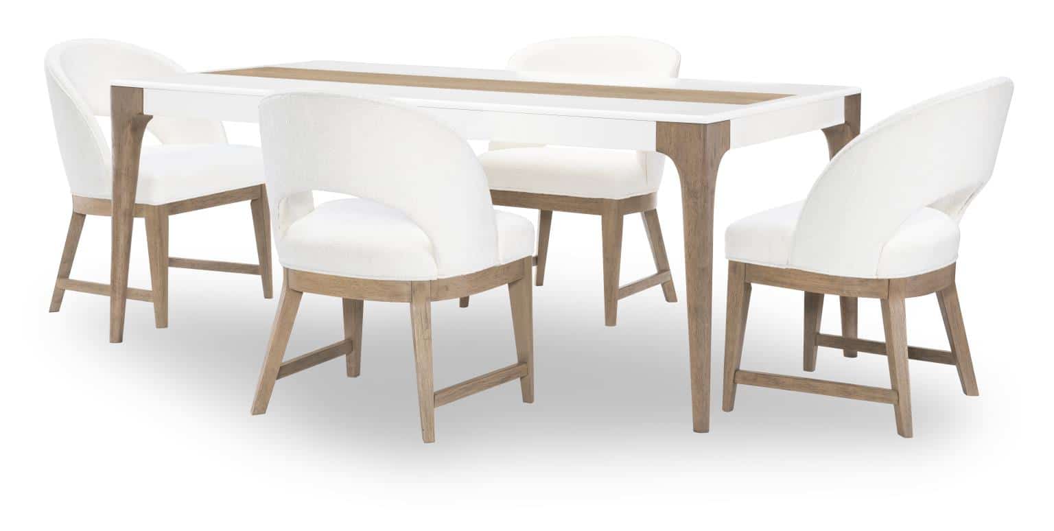 Product Description: 4230-220 Rectangular Dining Table - Crafted of Select Hardwood Solids and White Oak Veneers.Cloud White and Desert Oak Finish. Golden Sand Metallic Accents.