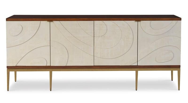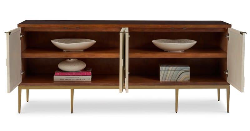 Product Description: Ambella Home 02407-630-001 Ingrid Cabinet - This four door cabinet features an abstract, linen wrapped relief on its door fronts. The case is walnut stained, straight grain White Oak, raised on a metal, antique brass finished base. Minimalistic door pulls match the base. Adjustable shelves included.