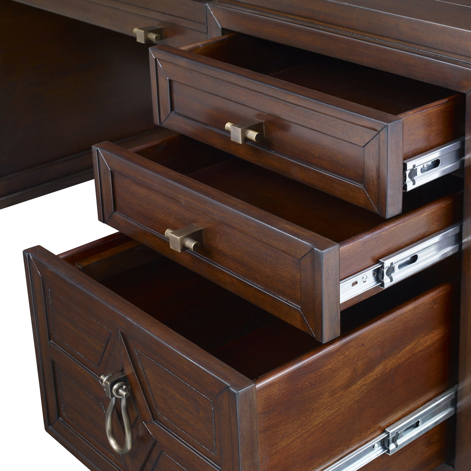 Product Description: Ambella Home 04602-320-374 Diamond Executive Desk Dark - Crafted from Mahogany with a walnut finish, this desk features one pencil drawer, four storage drawers and two file drawers all with full extension metal glides and solid brass hardware. The steel legs include an antique gold finish.