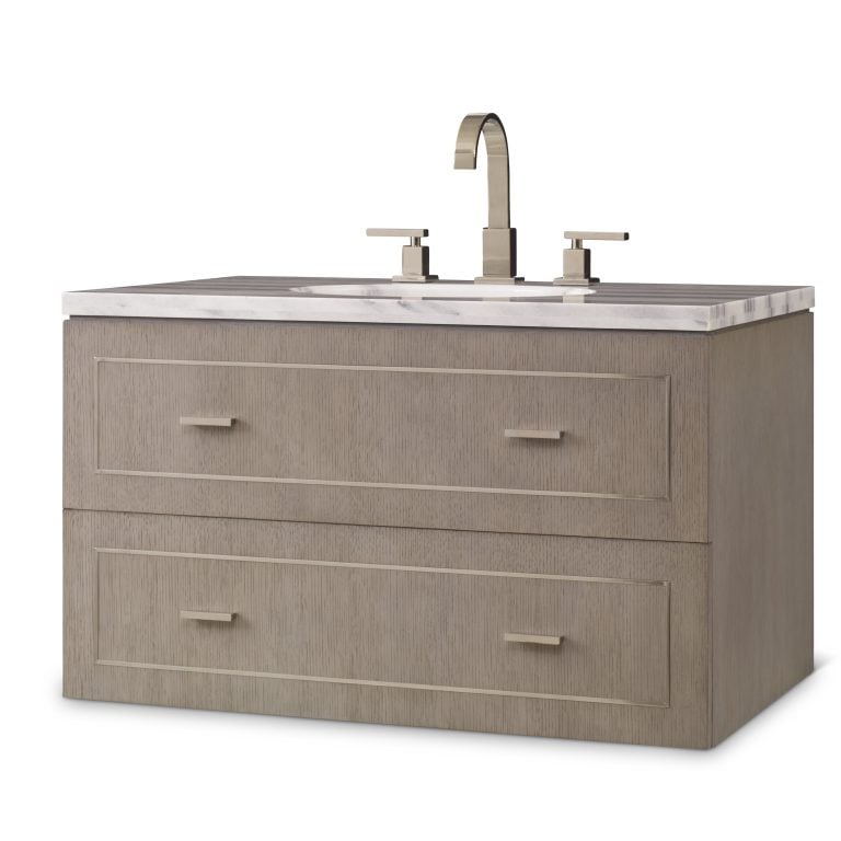 Product Description: Ambella Home 07230-110-201 Albany Medium Wall Sink Chest - Statuario marble tops this warm grey finished case with stainless steel details. Stainless pulls on one working drawer. Porcelain sink bowl is included. Hangs in metal cleats (included).