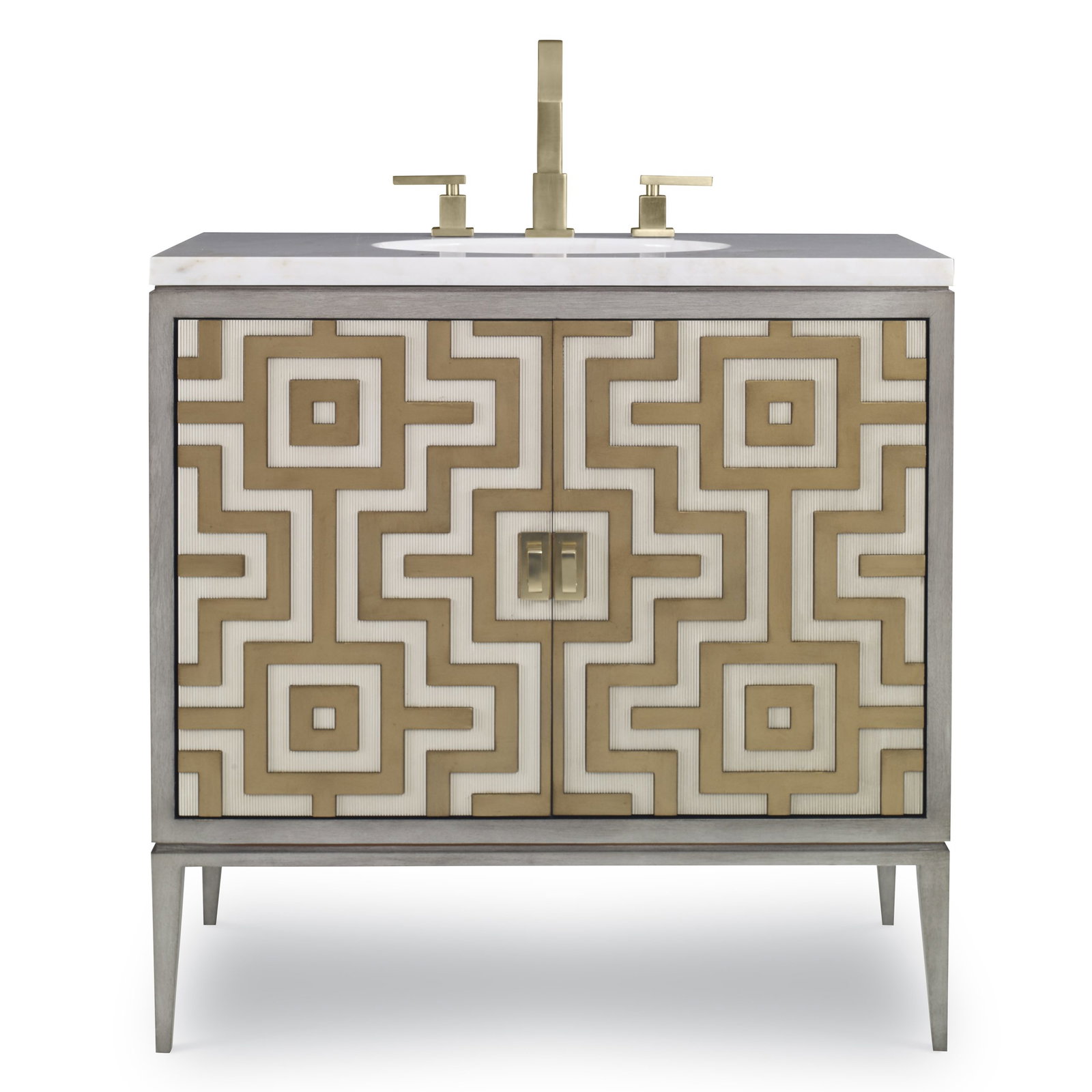 Product Description: Ambella Home 07250-110-301 Labyrinth Sink Chest - Crafted from Mahogany solids and veneer, this sink chest features two doors layered with gold painted fretwork over ivory textured panels. The outside, top and base are finished in ash grey. Brass hardware completes the look. The Primavera White marble top comes with an oval porcelain sink bowl.