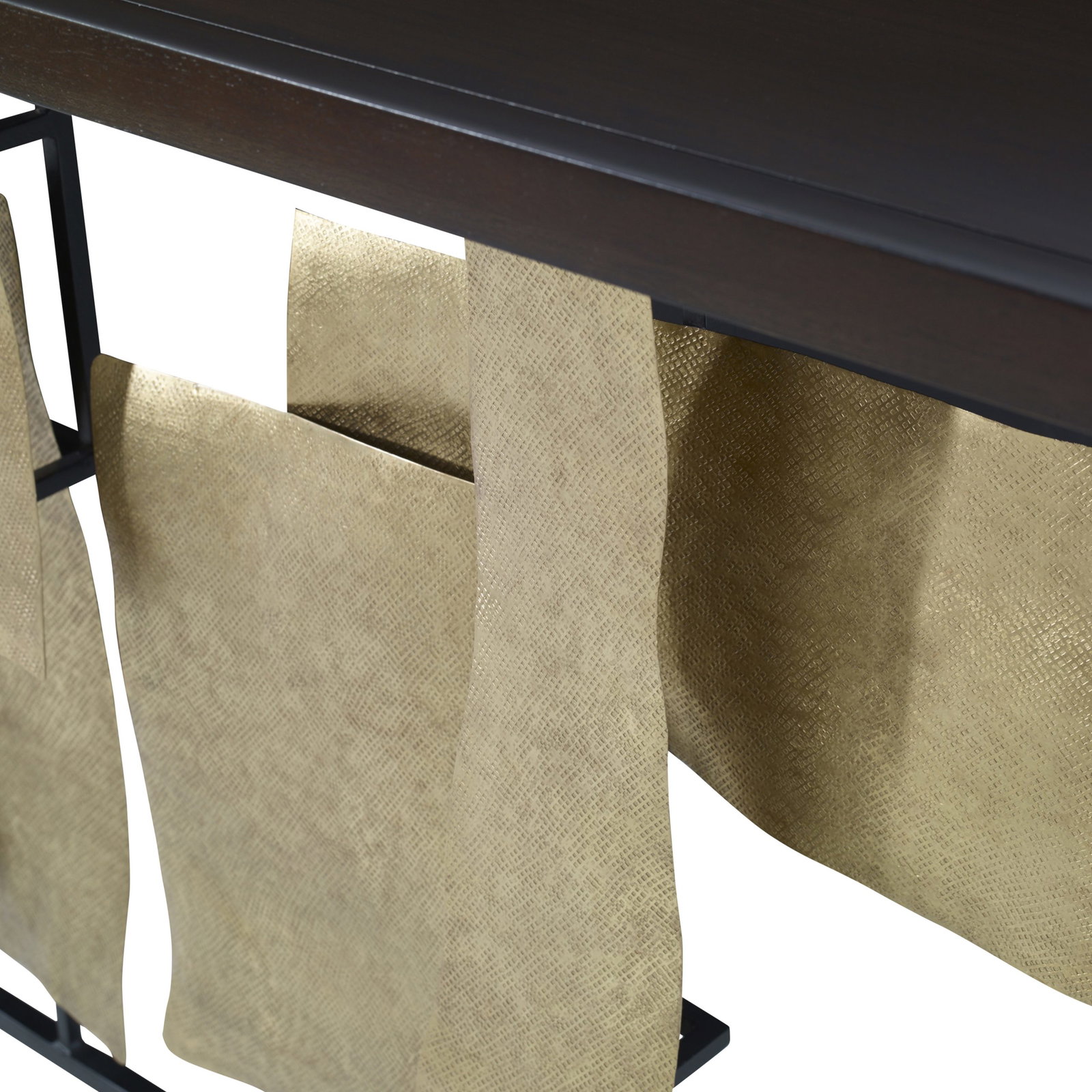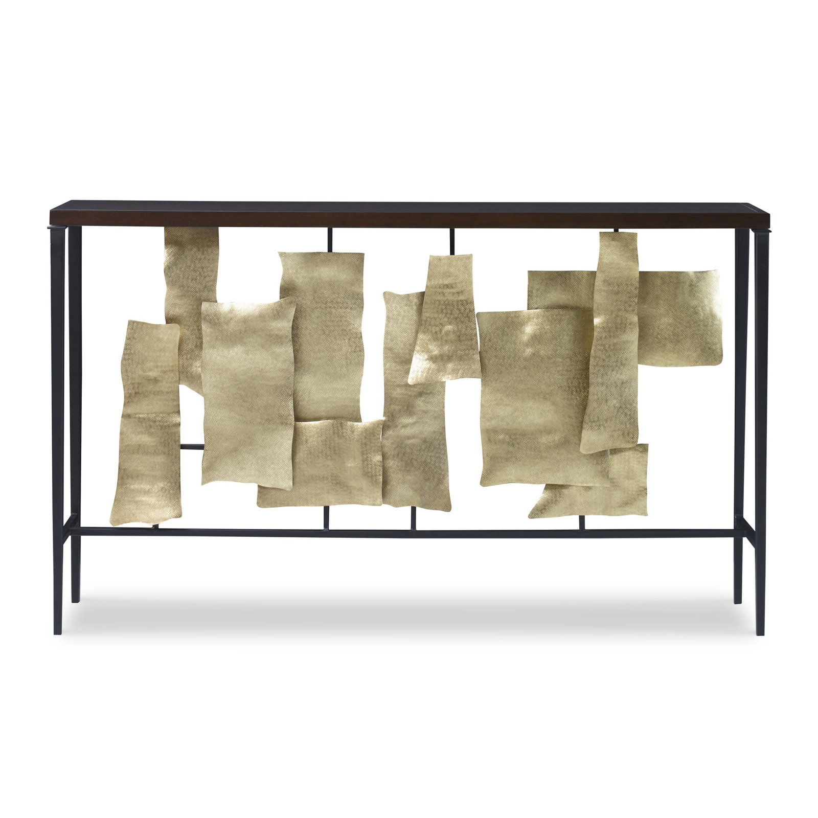 Product Description: Ambella Home 07279-850-001 Collage Console Table - This sculptural console consists of textured metal plates suspended below a Mahogany and Walnut veneer table top. Metal tapered legs and stretcher finished in matte black support the console.