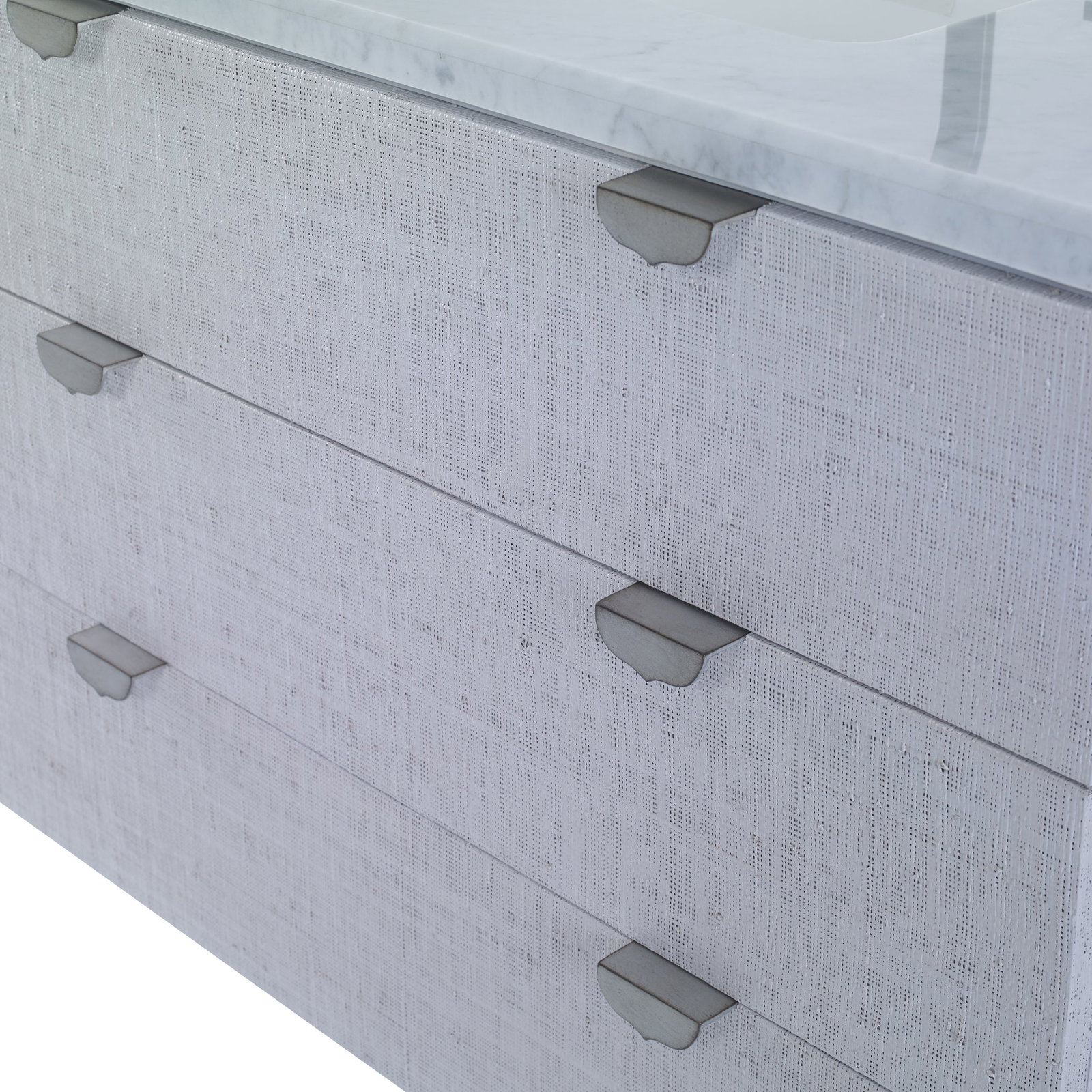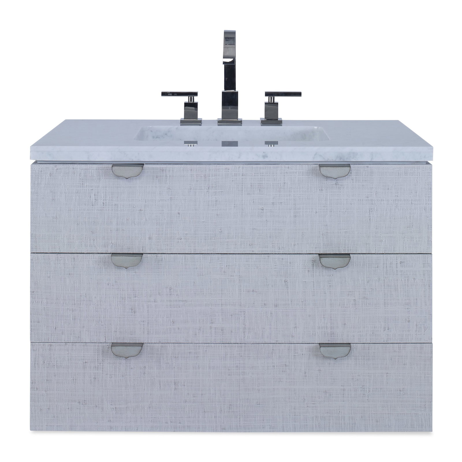Product Description: Ambella Home 07296-110-301 Adaline Wall Mount Sink Chest - Wrapped in raffia, this wall-mounted sink chest includes two working drawers with silver finished hardware. A quartz top complements the white porcelain sink bowl. Brackets are included to install chest securely to the wall. The vanity is also available for purchase without the top. Designed by Shayla Copas.