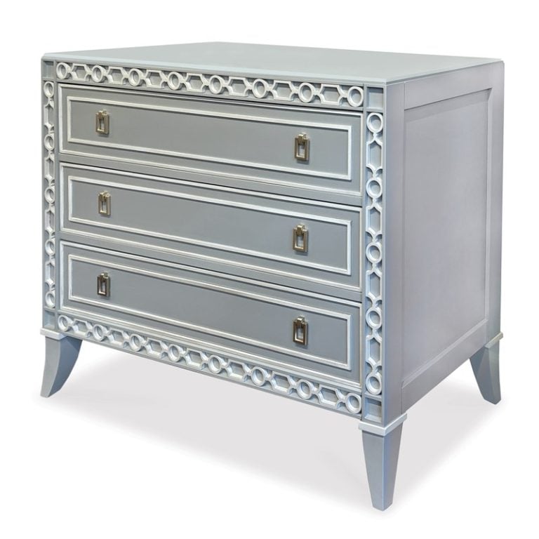 Product Description: Ambella Home 07313-830-001 Annalie Chest - Finished in Polar Blue with Linen accents, this three drawer chest features carved fretwork encircling the front of this silhouette. Brass hardware. Soft close drawers.
