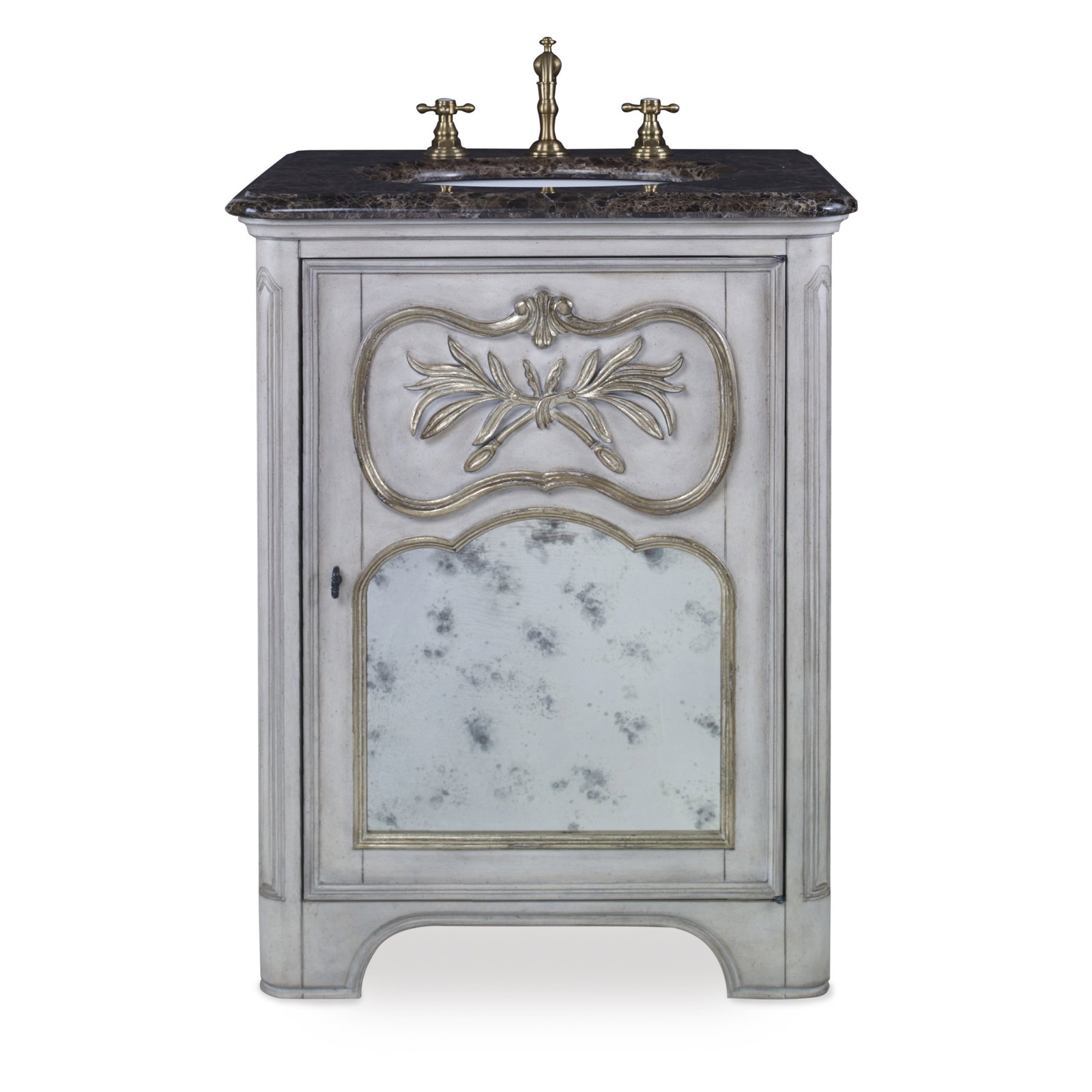 Product Description: Ambella Home 08989-110-121 Laurel Petite Sink Chest White - Made of mahogany solids and veneer in an antique white finish with antique gold accents. Single door design features hand carved wooden laurel and antique mirror panel. Open storage beneath sink. Dark Emperador marble top.