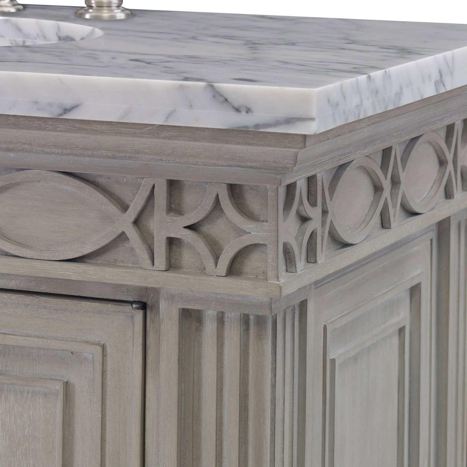 Product Description: Ambella Home 08991-110-401 Seville Sink Chest - This intricate sink chest features a geometric tracery design which wraps the front and sides. Mahoni solids and veneer are finished in a French white. A white Carerra marble top includes an installed white porcelain sink bowl.