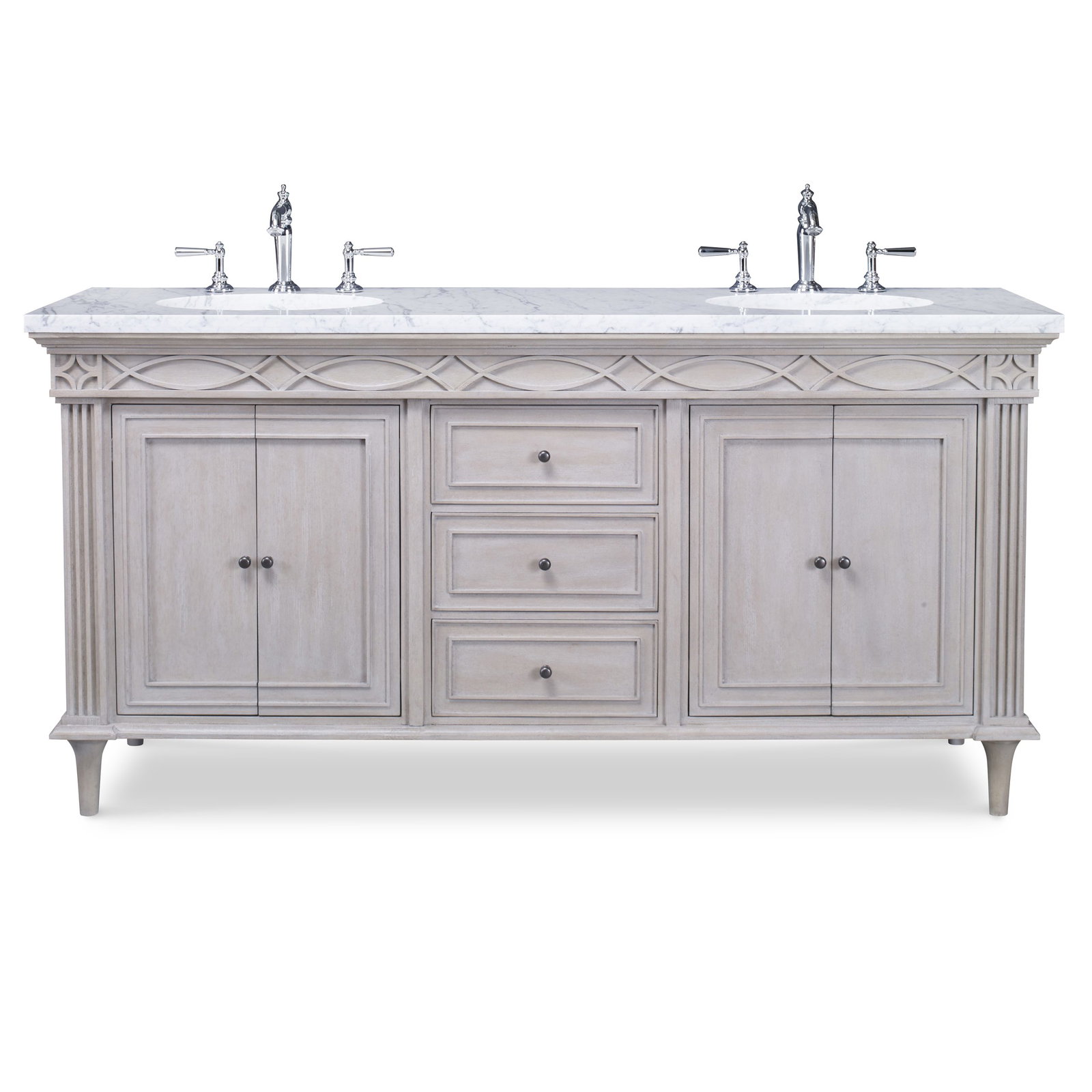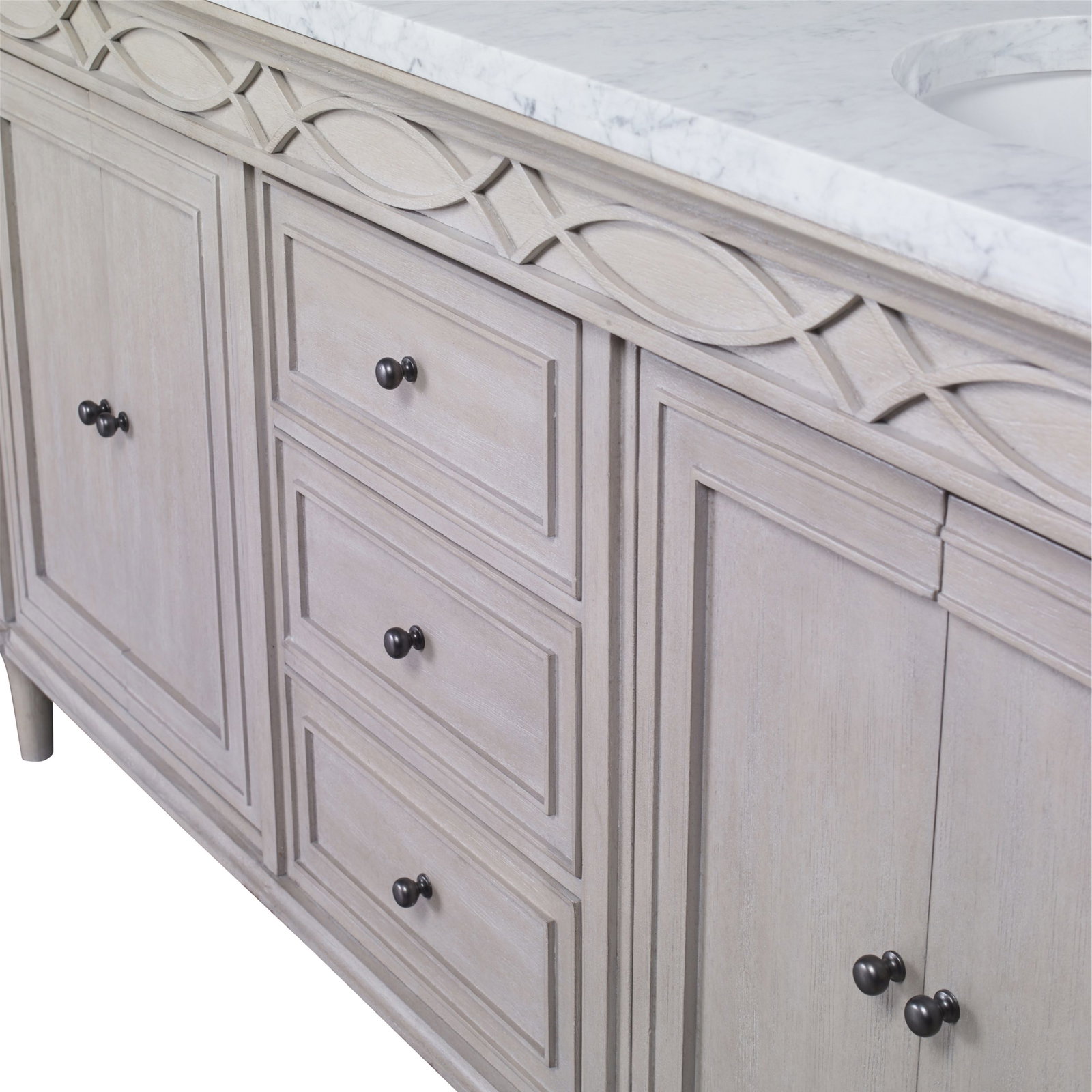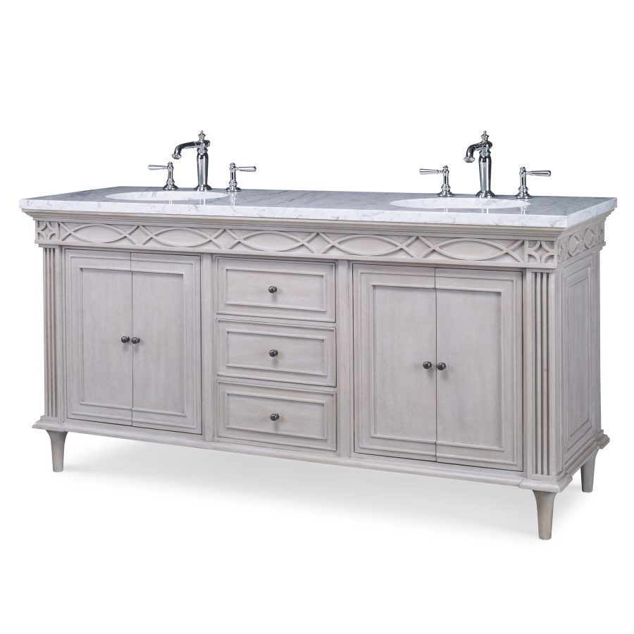 Product Description: Ambella Home 08991-110-601 Seville Double Sink Chest - This intricate sink chest features a geometric tracery design which wraps the front and sides. Mahoni solids and veneer are finished in a French white. One adjustable shelf in each cabinet. Boasting a white quartz top and white porcelain sink bowls. The vanity is also available for purchase without the top.