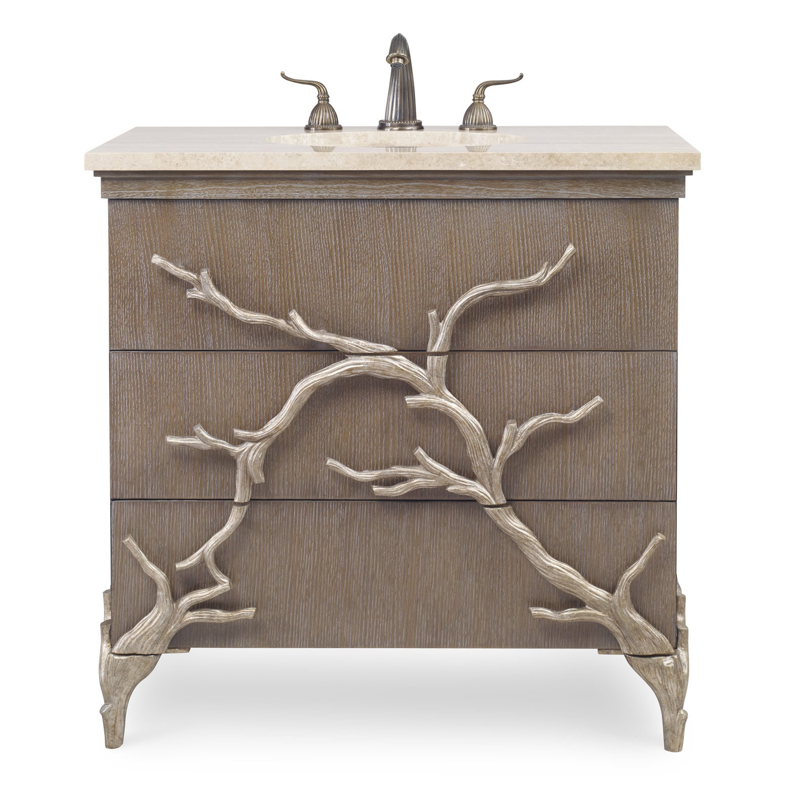 Product Description: Ambella Home 09116-110-301 Branch Sink Chest - Made of Mindi wood with Oak veneer. A dramatic cast tree branch creates the legs and drawer pulls on this stunning sink chest. The warm wood finish complements the silver Travertine stone top. Two working drawers. Balsa porcelain sink bowl included.