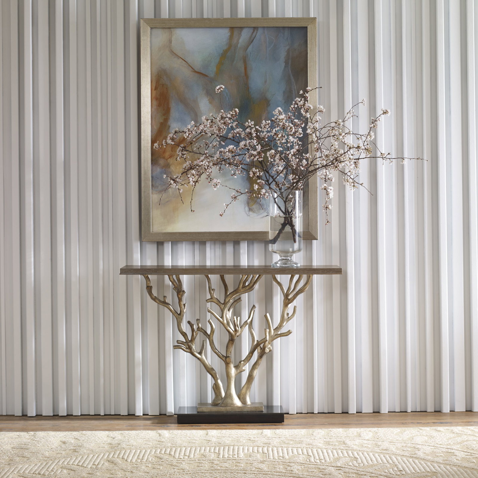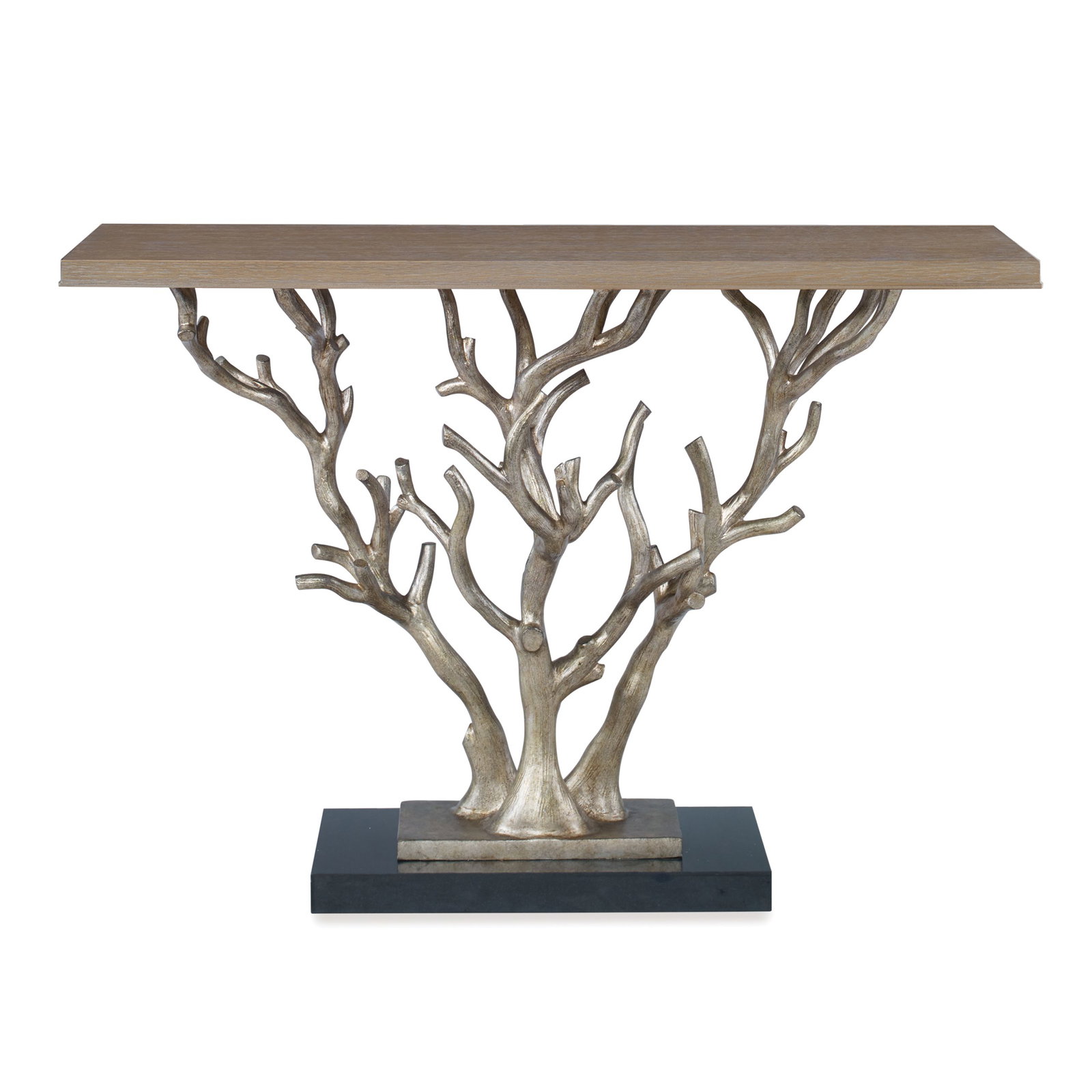 Product Description: Ambella Home 09145-850-001 Woodland Console Table - This tree branch inspired console features a small cast aluminum base finished with antiqued silver metal leaf and set on top of a larger black granite base. Top is American White Oak in a ceruse finish.