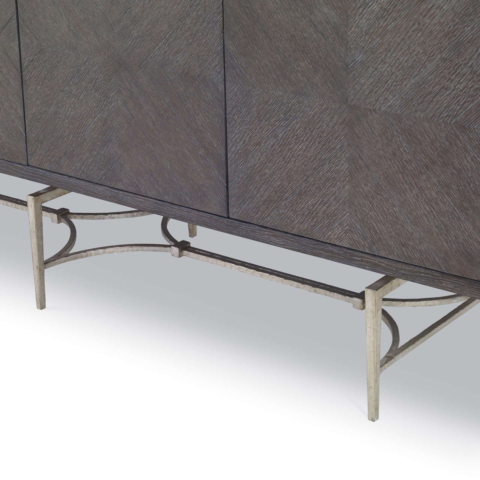 Product Description: Ambella Home 09150-630-001 Double Diamond Multi-Use Cabinet - This elegant cabinet features four herringbone Oak veneer patterned doors. Crafted from White Oak, the cabinet is raised on silver leaf hammered legs and diamond shaped stretchers. Adjustable shelves are included.