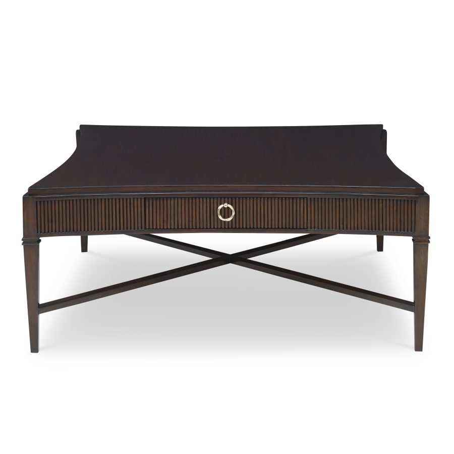 Product Description: Ambella Home 09170-920-001 Reeded Cocktail Table - Concave sides give this cocktail table an unusual silhouette. The reeded apron is supported by tall, tapering legs with X stretchers. One drawer with brass hardware is included. Crafted from Walnut.