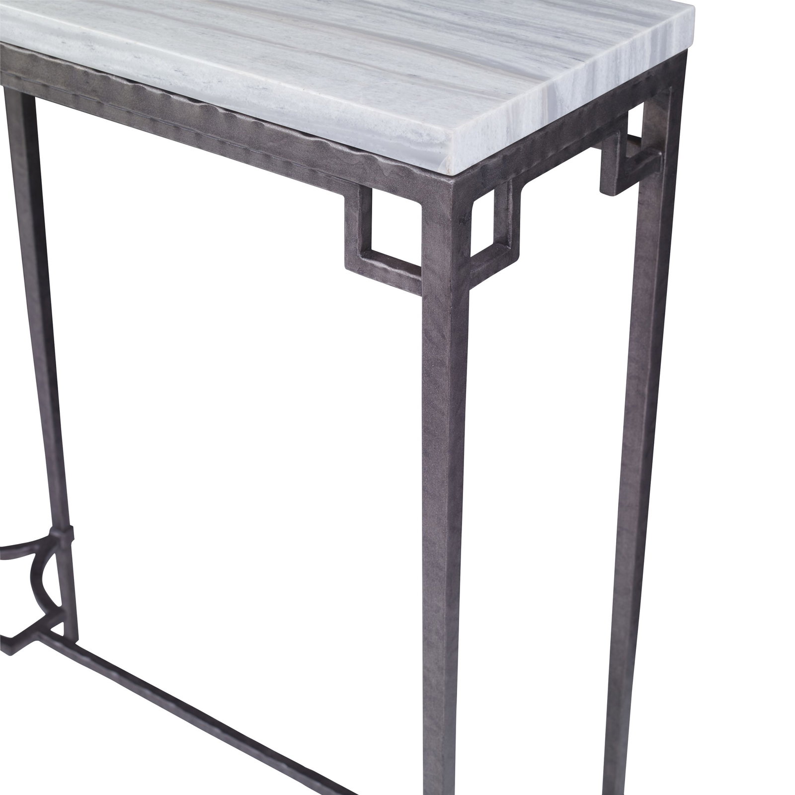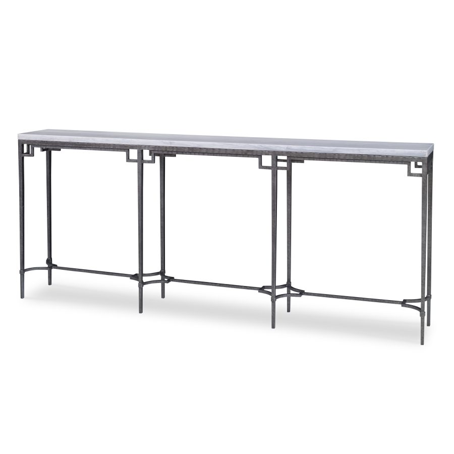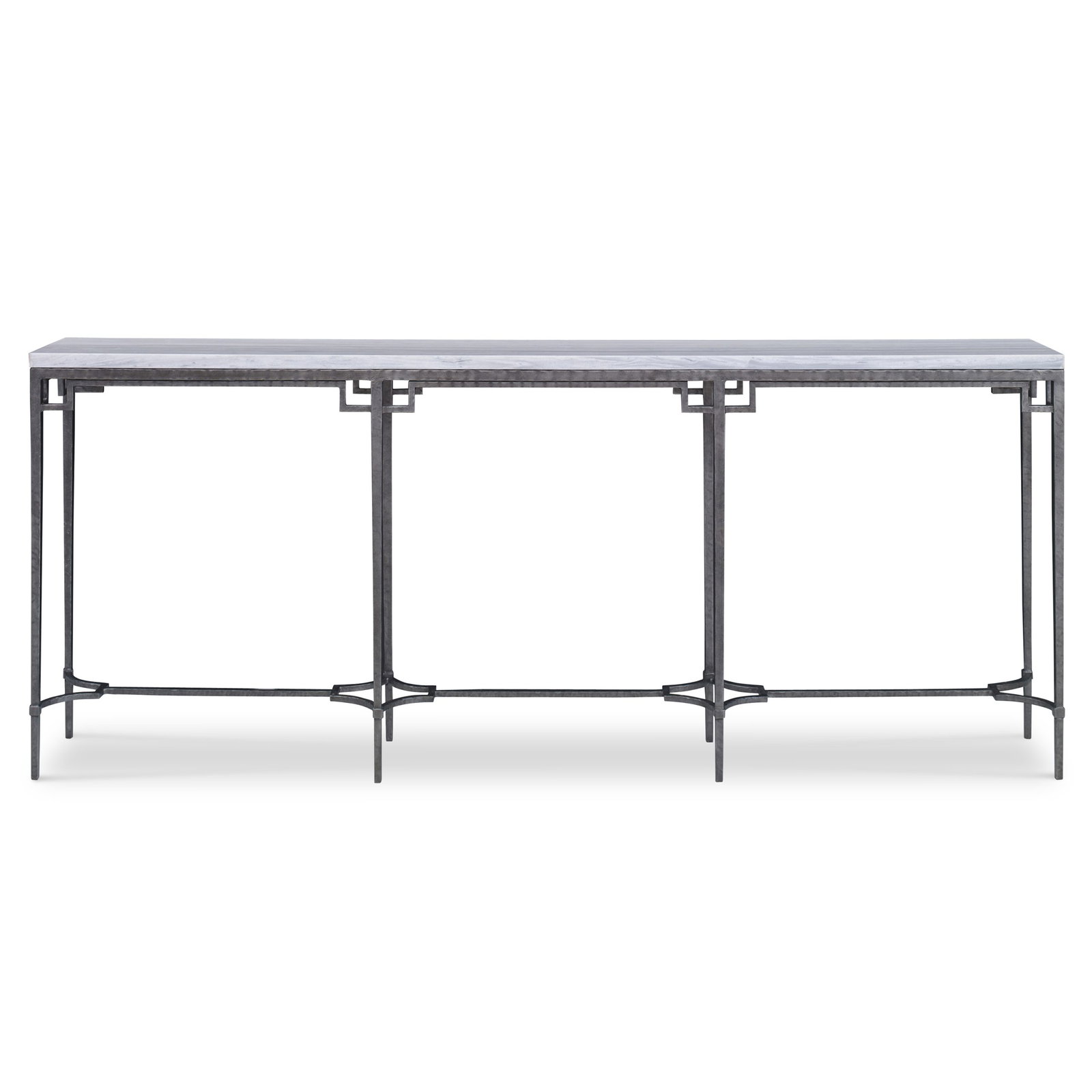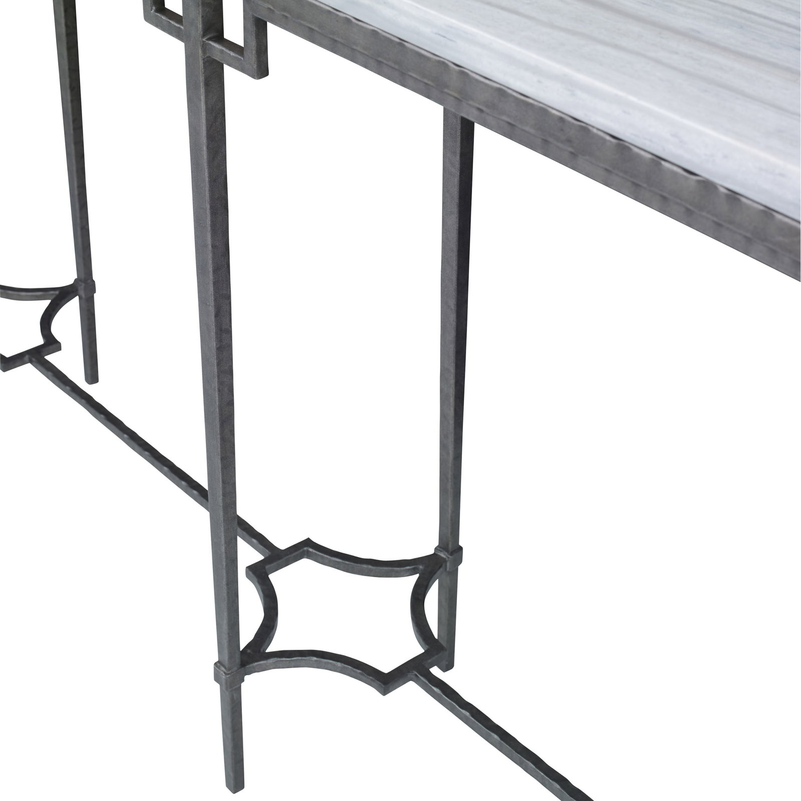 Product Description: Ambella Home 09190-850-001 Bennett Sofa Table - This sofa height table features a hand forged metal frame with a hammered texture. A polished Nestos stone top is supported by tall tapering legs, with decorative brackets and diamond shaped stretchers.