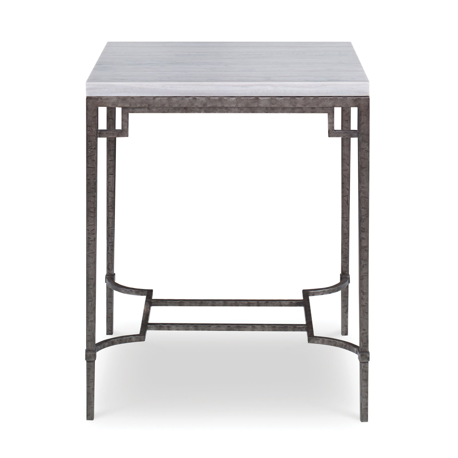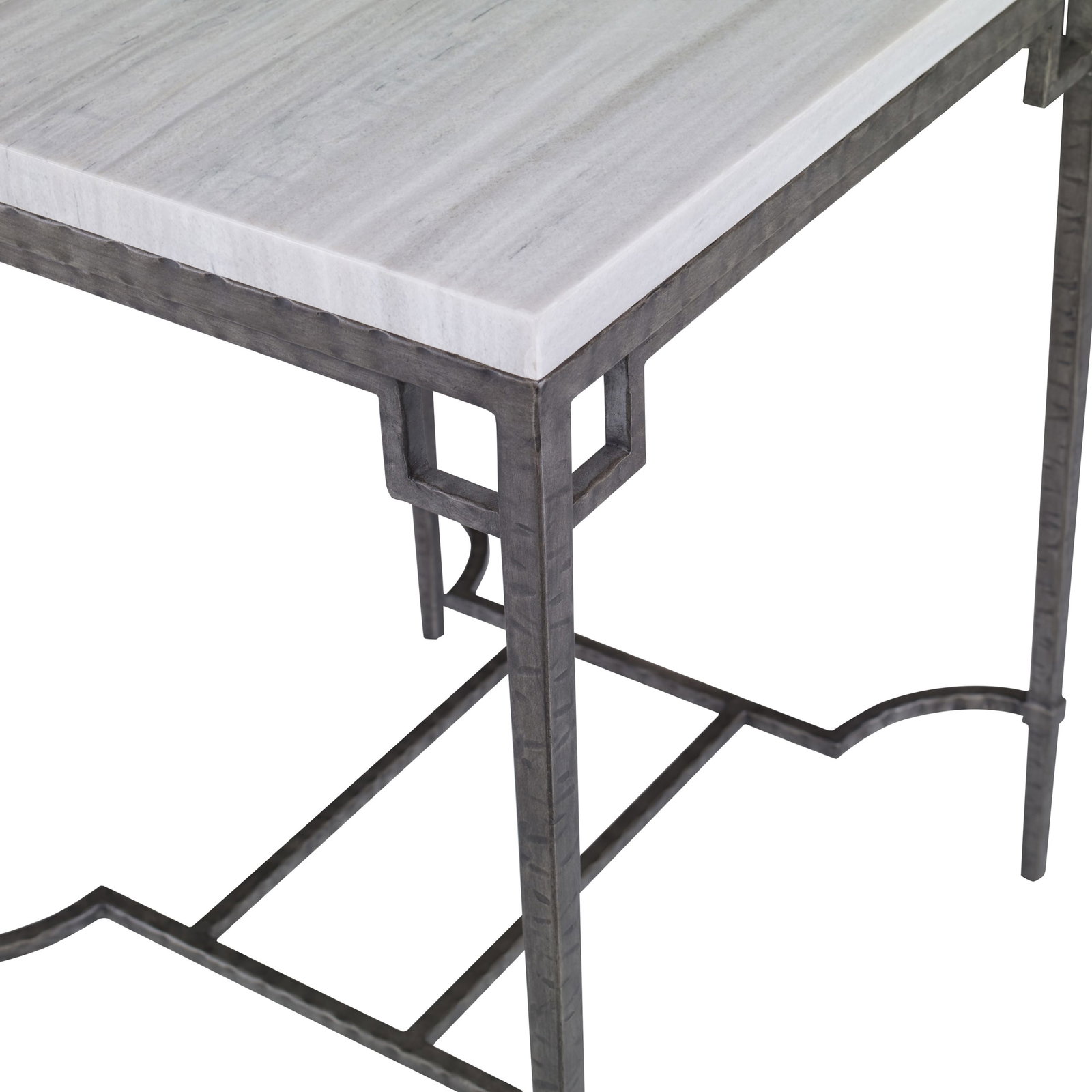 Product Description: Ambella Home 09190-900-001 Bennett End Table - A polished Nestos marble top is supported by a hand forged metal frame with a hammered texture. Decorative brackets and arching stretchers coomplete the look.