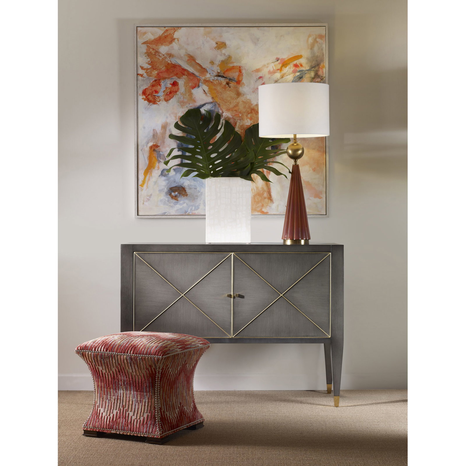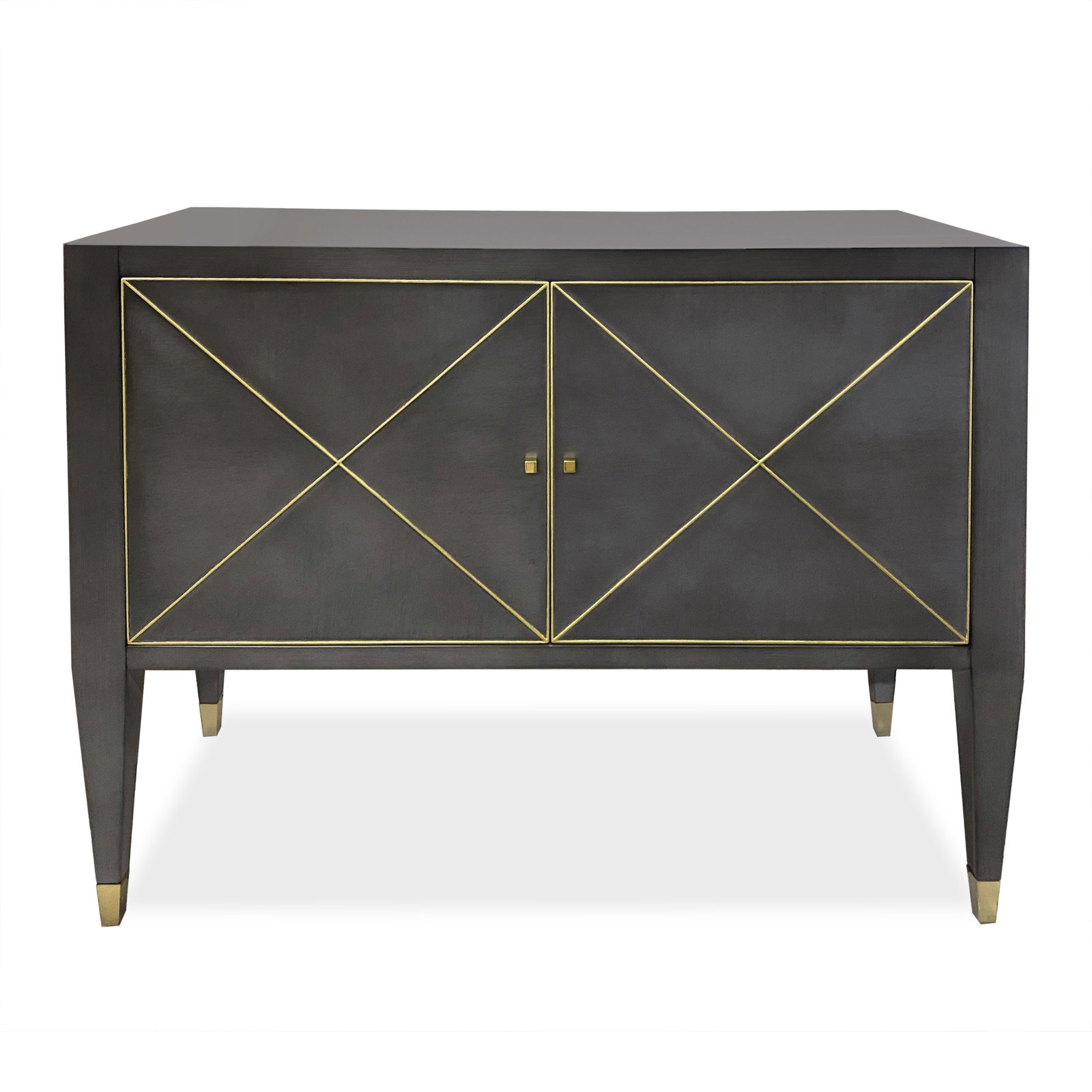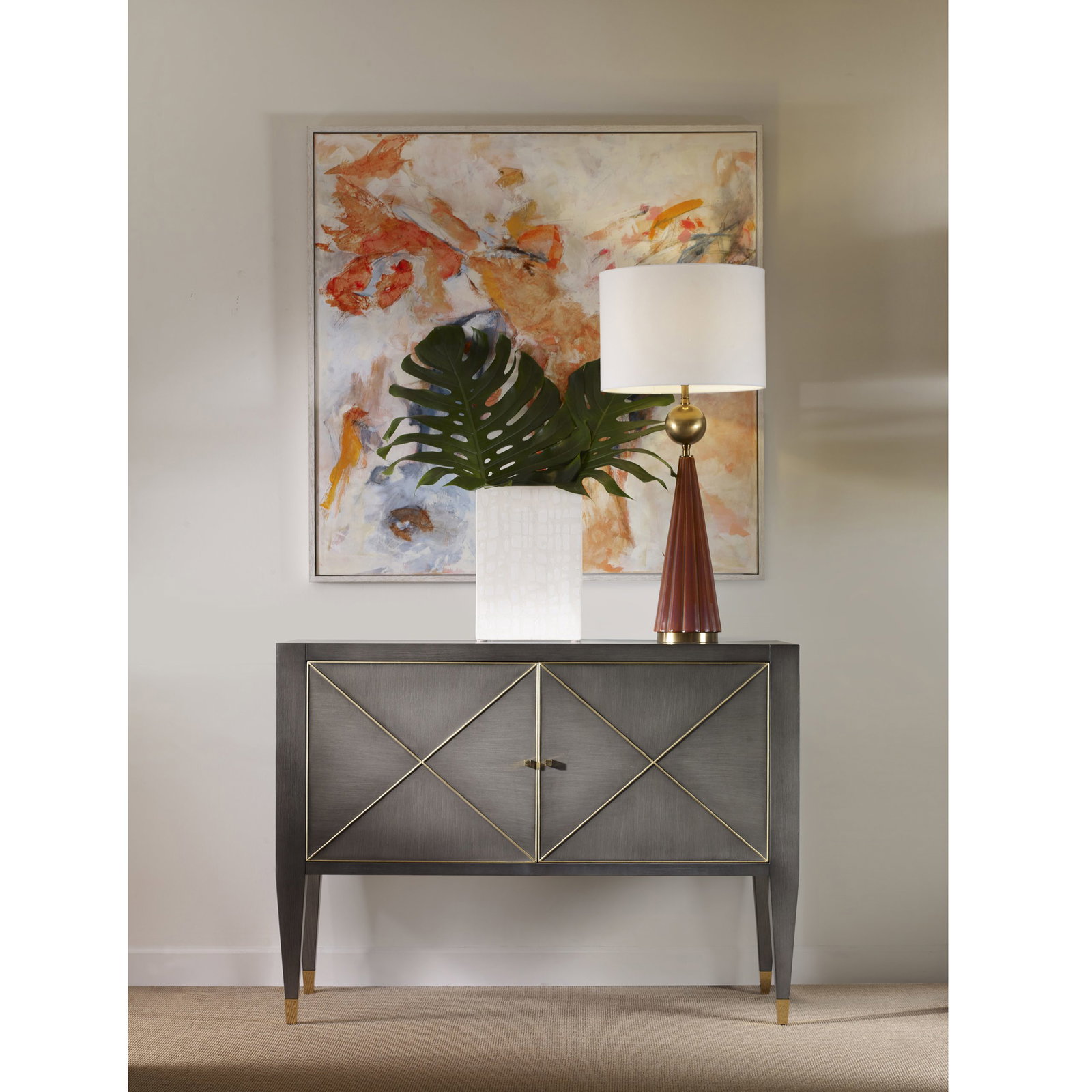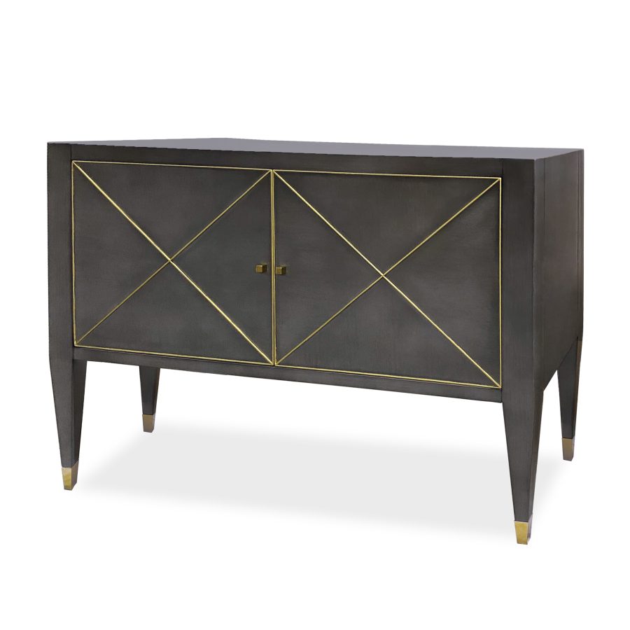 Product Description: Ambella Home 09209-820-010 Beaumont Cabinet Custom - Crafted from Mindi, this two door cabinet features a raised X motif on the front of each door. Raised on tall tapered legs terminating in brass ferrules. One adjustable shelf is included. Shown in smoke with gold leaf striping.