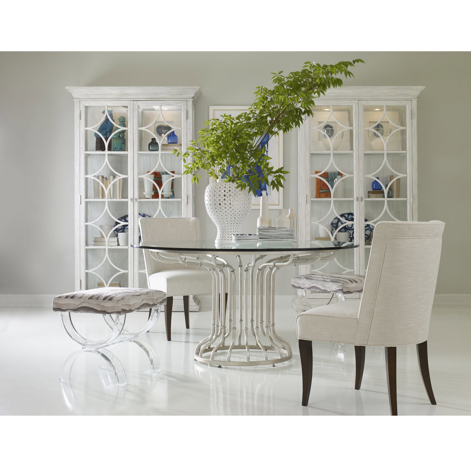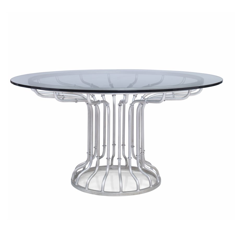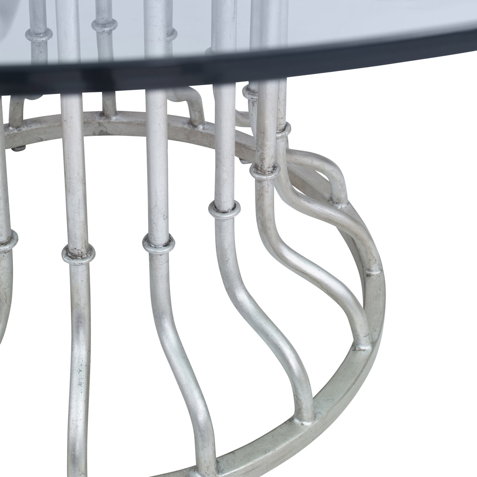 Product Description: Ambella Home 09210-640-001 Café Dining Table - This metal flared table base is reminiscent of Parisian tables of the early 1900’s. The antiqued silver leaf base supports a 5/8" thick clear glass top.