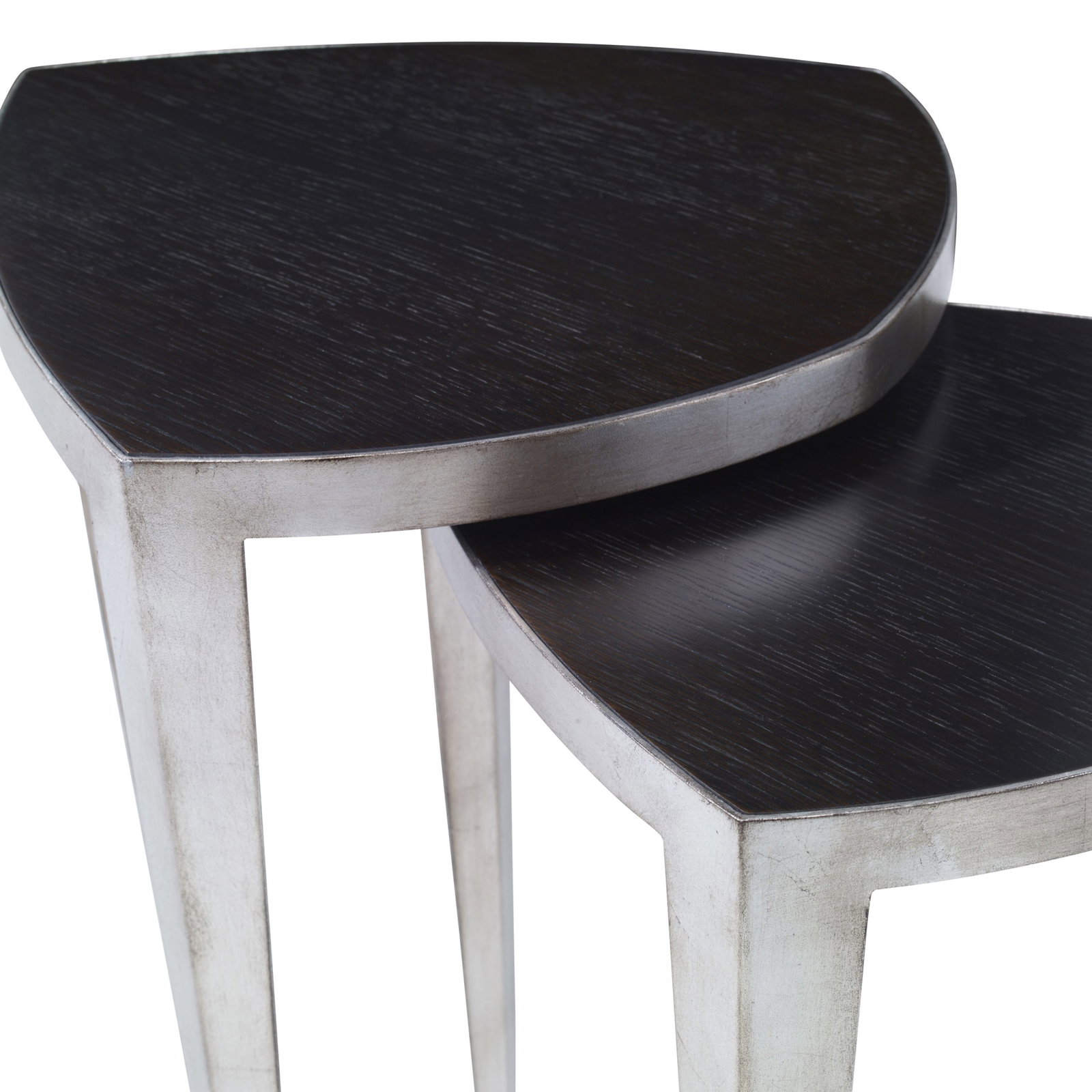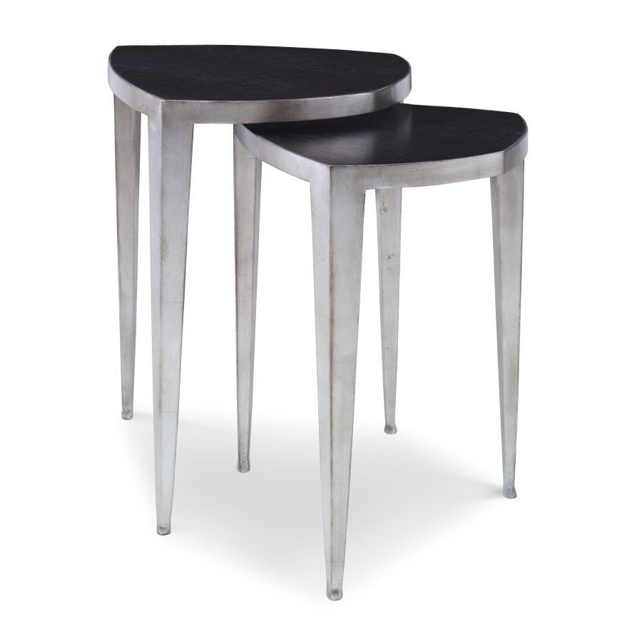 Product Description: Ambella Home 09215-900-026 Reuleaux Bunching Tables Rubbed Raven - These triangular shaped bunching tables include a silver finished three legged base with Oak veneered tops. The tables are sold together as a set. One is 24" high and the other is 22" high. Top is finished in hand rubbed raven.