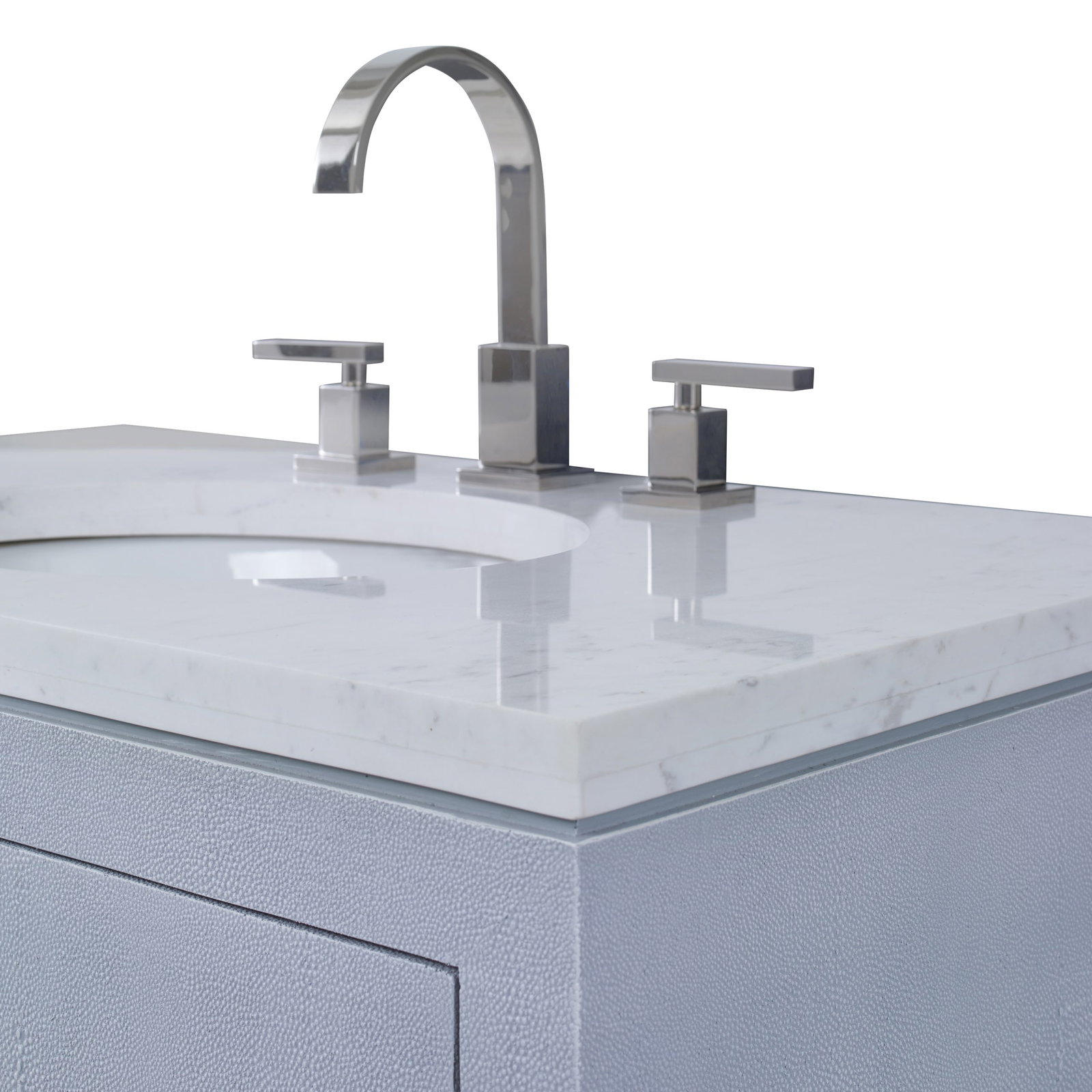 Product Description: Ambella Home 09223-110-335 Shagreen Sink Chest Polar Blue - This minimalistic sink chest features a clean, two door cabinet wrapped in faux leather shagreen. A Nestos grey marble top features a porcelain sink bowl. Acrylic hardware with your choice of polished chrome or polished brass accents included.