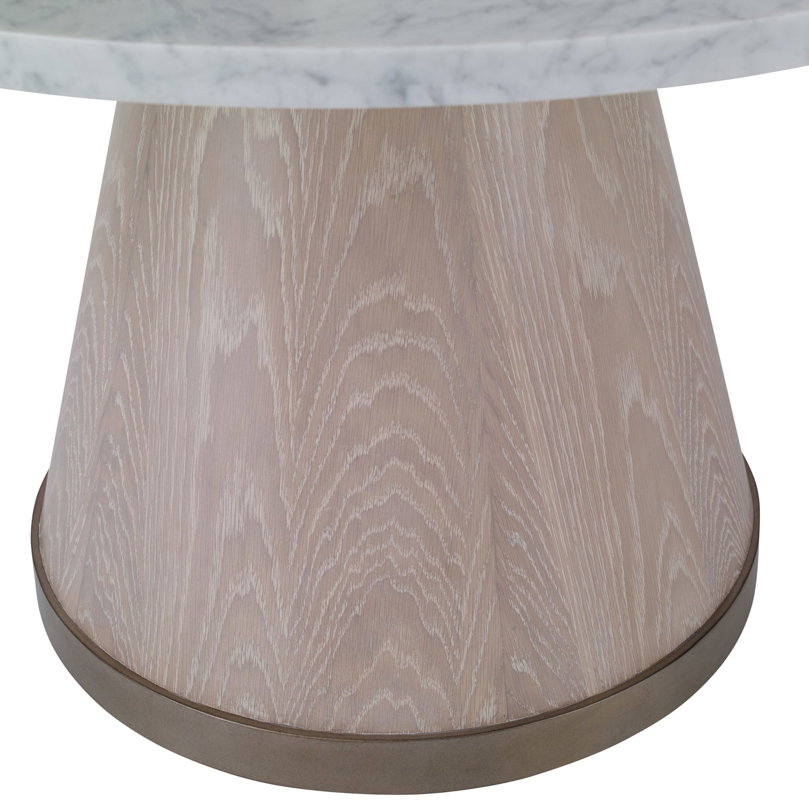Product Description: Ambella Home 09249-600-036 Treyton Dining Table Ceruse - A round center table composed of a tapering cone pedestal topped with a bullnose round Carrera marble top. The pedestal features a bronze finished base. Oak solids with Oak veneer.