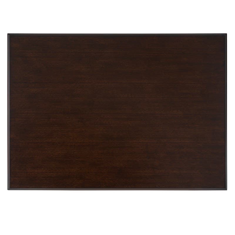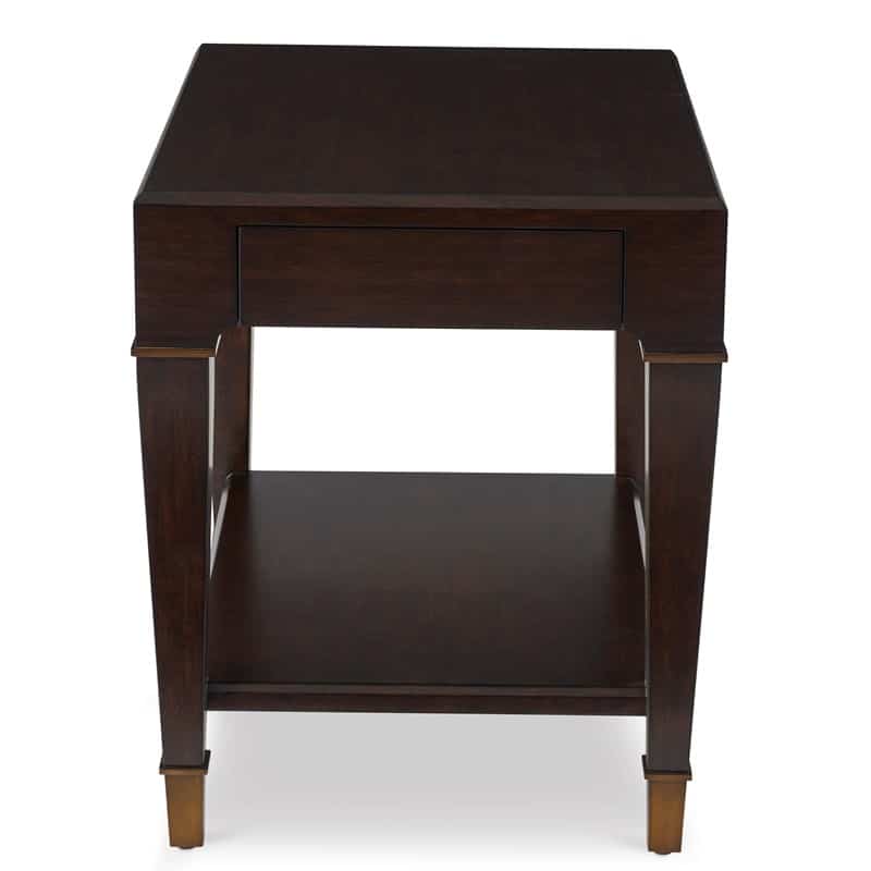 Product Description: Ambella Home 09322-900-002 Whitehaven Rectangular End Table - This rectangular end table includes a Walnut top raised over a shaped apron with tall tapering legs and a suspended shelf. A hidden drawer with a recessed finger pull creates storage. Antique brass ferrules complete the look. Mahogany solids and Walnut veneer. Finished in a rich walnut.