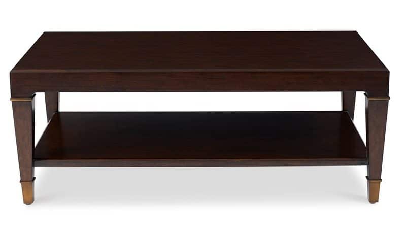 Product Description: Ambella Home 09322-920-001 Whitehaven Cocktail Table - This rectangular cocktail table includes a walnut top raised over a shaped apron with tall tapering legs and a suspended shelf. Antique brass ferrules complete the look. Mahogany solids and Walnut veneer. Finished in a rich walnut.
