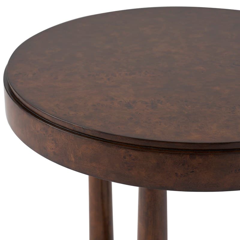 Product Description: Ambella Home 09323-900-001 Vienna End Table - This classically inspired end table includes a Mappa Burl round top and apron, raised on turned and tapered columns. The spiraling stretchers tie the legs together at the base. Agatis wood solids and Mappa Burl veneer.