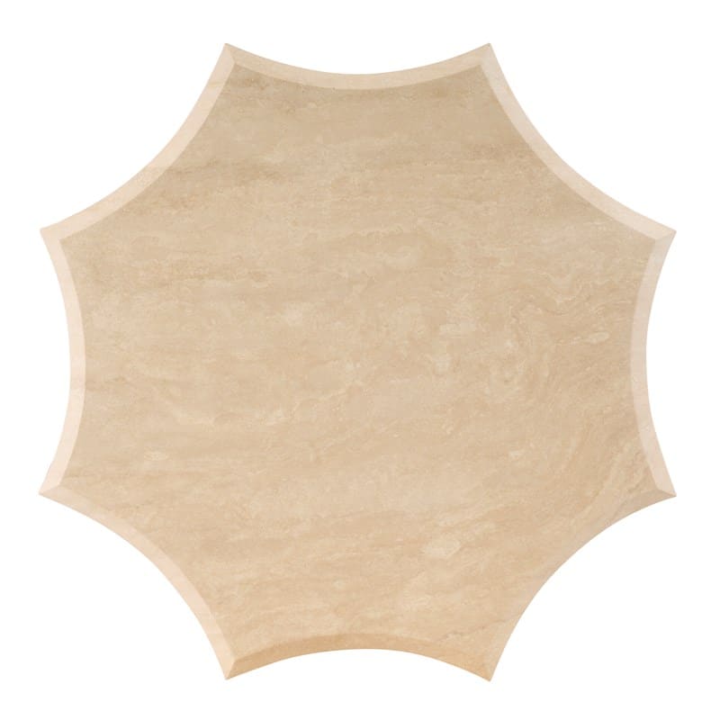 Product Description: Ambella Home 09345-900-001 Astra End Table - Crafted from Oak solids, this star shaped end table includes 8 legs which terminate in satin brass ferrules. A suspended, star shaped shelf features radial matched Oak veneer. Travertine top.