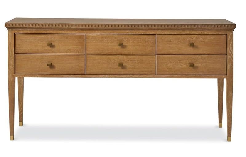 Product Description: Ambella Home 09347-630-010 Jenson Sideboard - Custom - This Oak sideboard features carved, dental molding around its apron. Raised on tall, tapering legs, this silhouette includes six drawers with satin brass pulls. Satin brass ferules complete the look. Shown in our light oak ceruse finish.