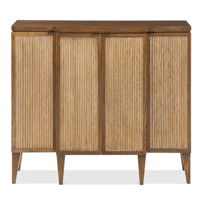 Product Description: Ambella Home 09350-630-001 Silas Sideboard - This petite breakfront sideboard includes four reeded panel doors raised on tapering legs. Oak veneers and solids. Antique brass hardware. Finished in stetson stain with oak ceruse contrasting doors. Adjustable shelves included.