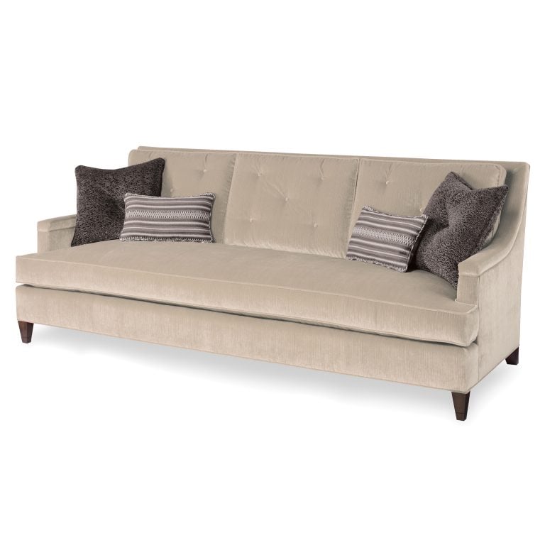 Product Description: Ambella Home 1244-01 Kennebunkport Sofa - This tall back sofa features padded arms that flow up and into a back border that outlines the inside back. Three boxed and buttoned back pillows are raised over a boxed bench cushion. The sofa is raised on solid Beechwood tapering legs. Two 20” buttoned throw pillows and two 11 x 19 throw pillows accompany the piece. This versatile sofa works well in both casual and formal settings, making it the perfect family room or living room sofa.