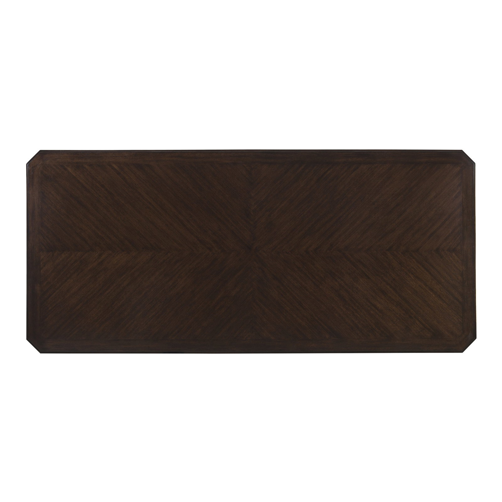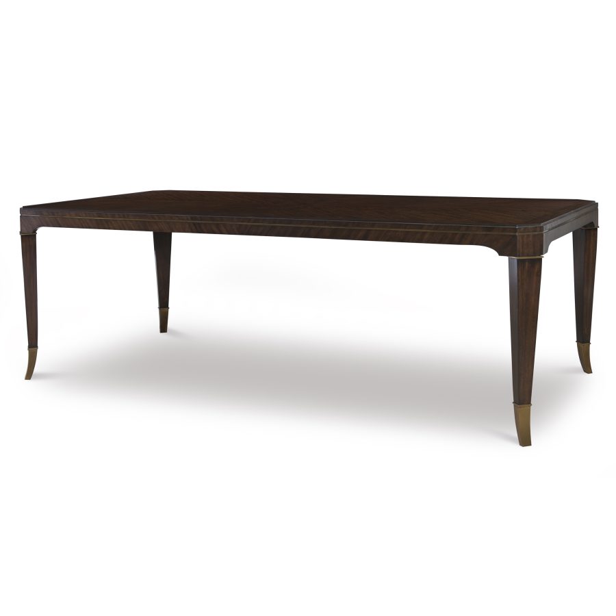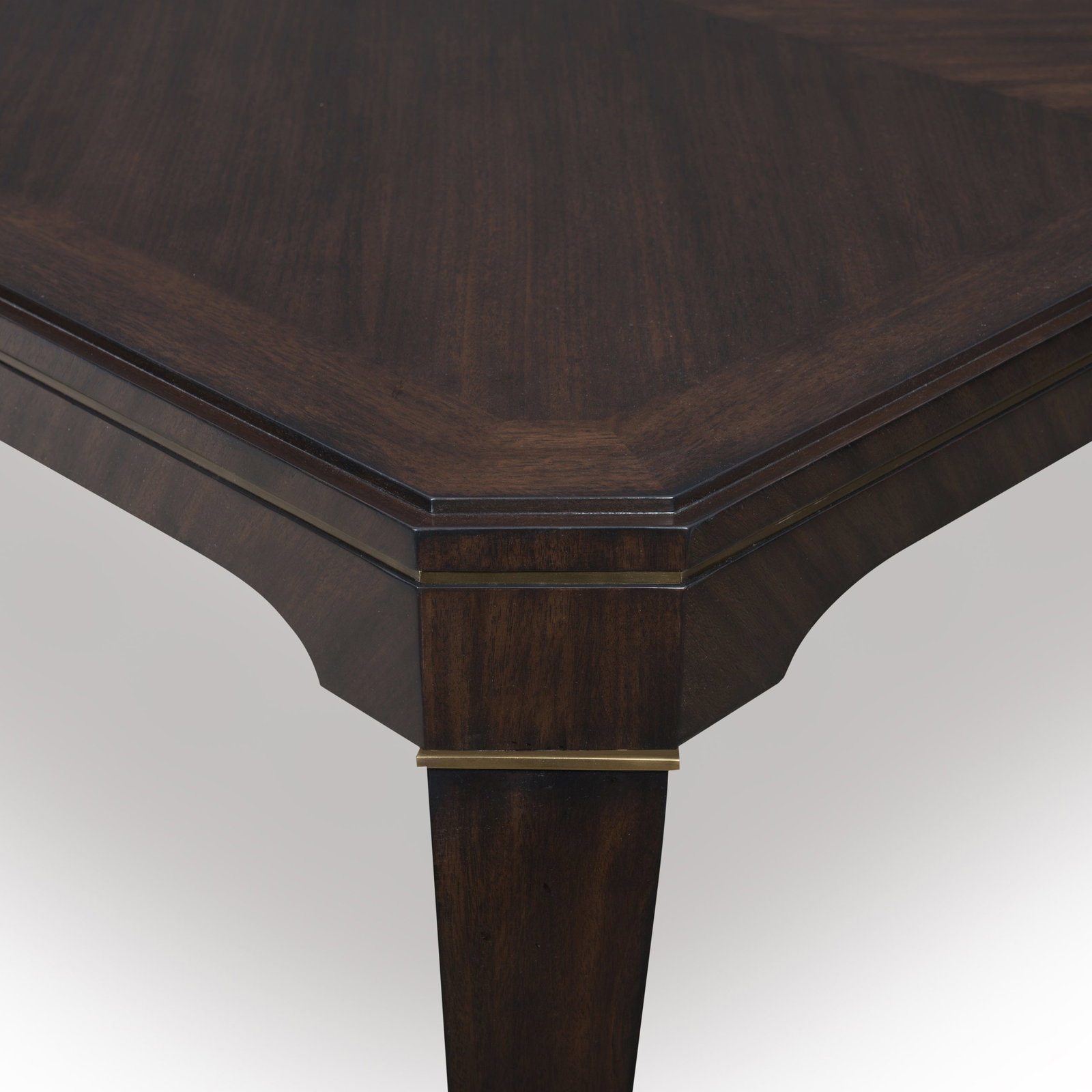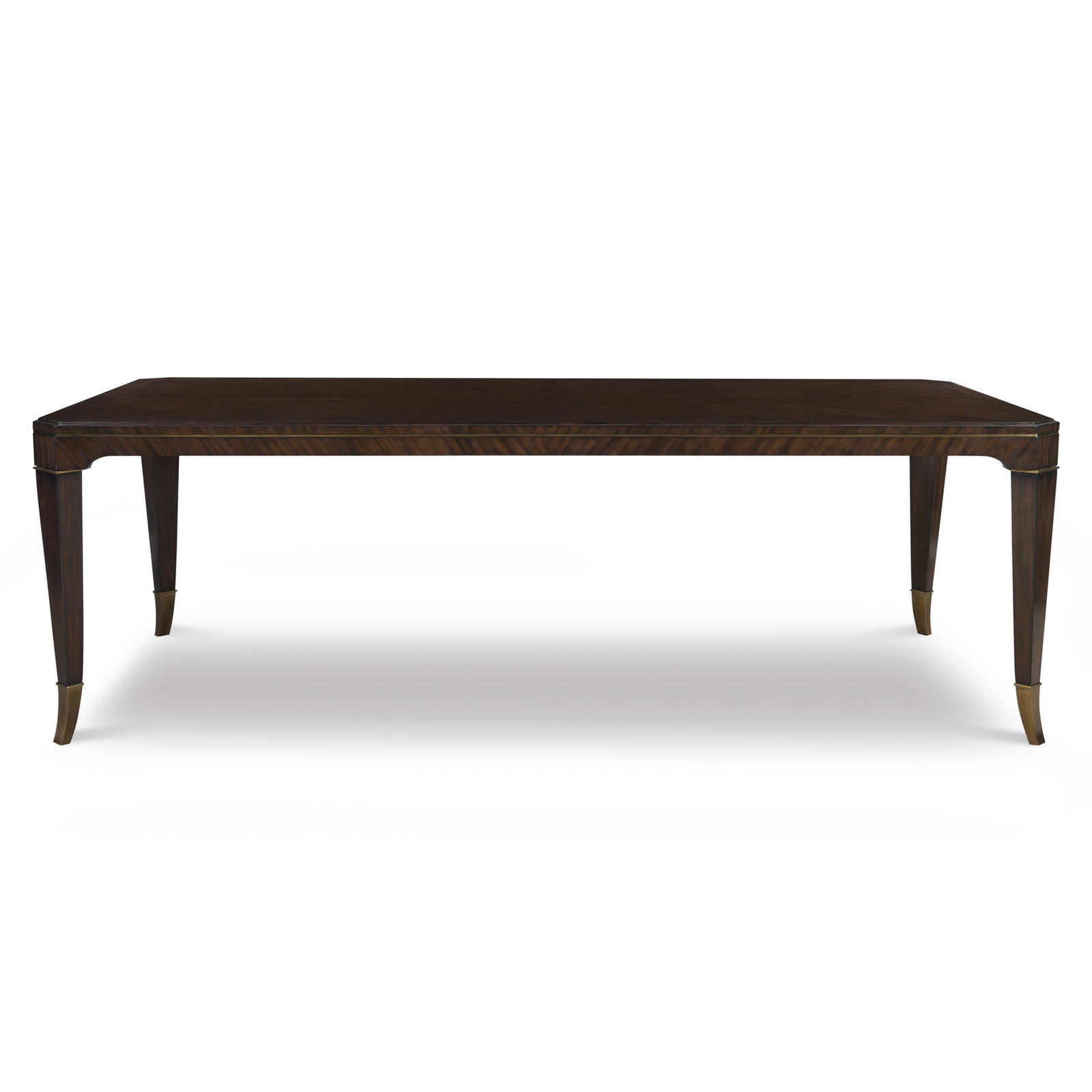 Product Description: Ambella Home 12587-600-078 Artemis Dining Table 78" To 122" - This rectangular dining room table consists of Walnut solids and Walnut veneer. Tall tapering legs are finished with brass ferrules. Brass trim accents the table apron as well as capping the tops of the legs. A book matched top includes edge banding. Finished in rich walnut. Includes two 22" leaves.