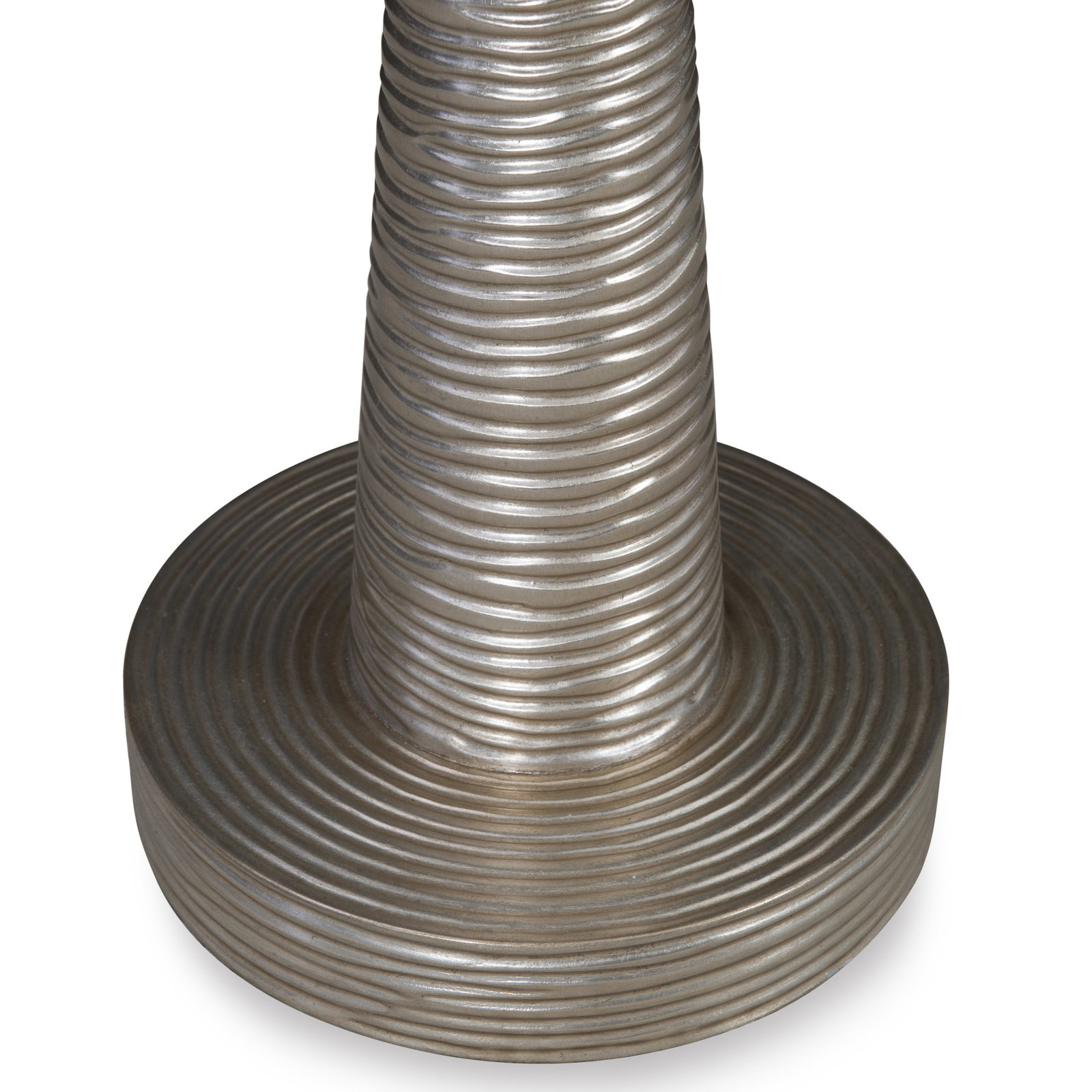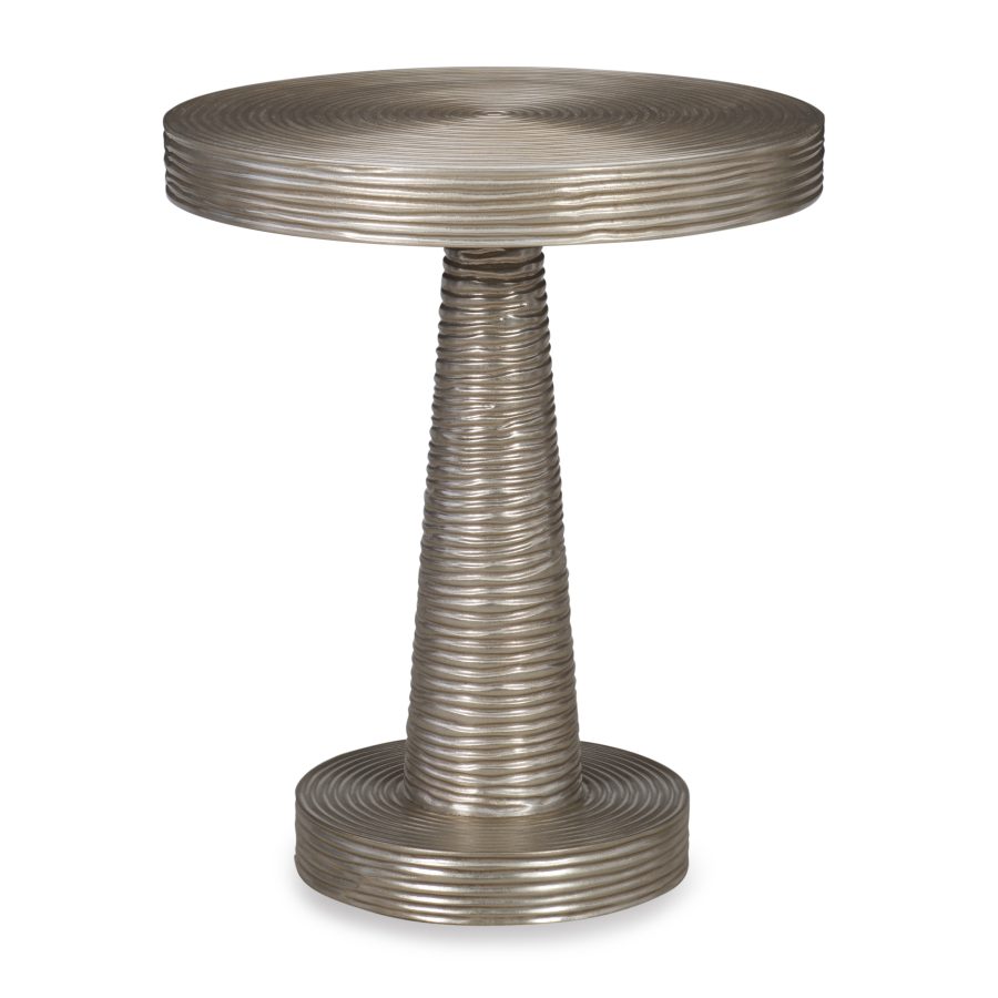 Product Description: Ambella Home 12588-900-001 Spiral Accent Table - Crafted from Mahogany, this pedestal accent table features textured spirals around its top, stem and base. Finished in an antiqued silver.