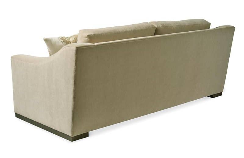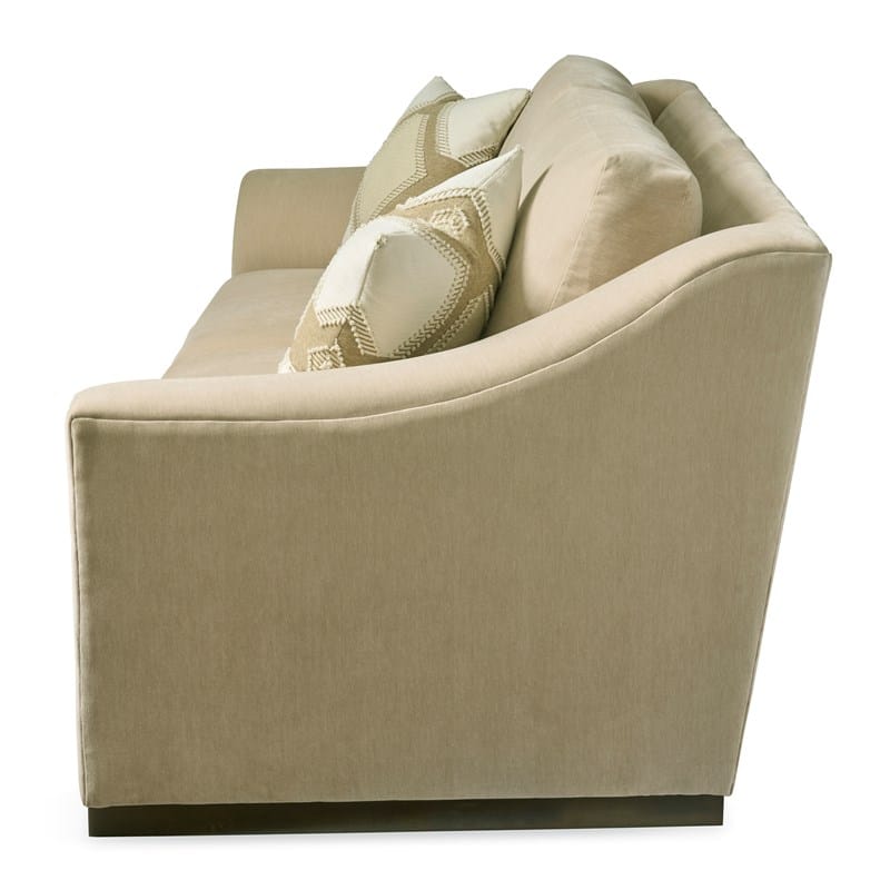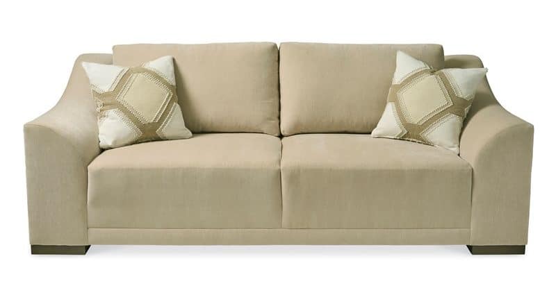 Product Description: Ambella Home 1277-02 Tobin Sofa - Two deep, attached seat cusions are raised over a streamlined border flanked with wide, shaped arms. The boxed back pillow and two 20" x 20" throw pillows add inviting softness. The complete silhouette is raised over a solid Beechwood sled base.