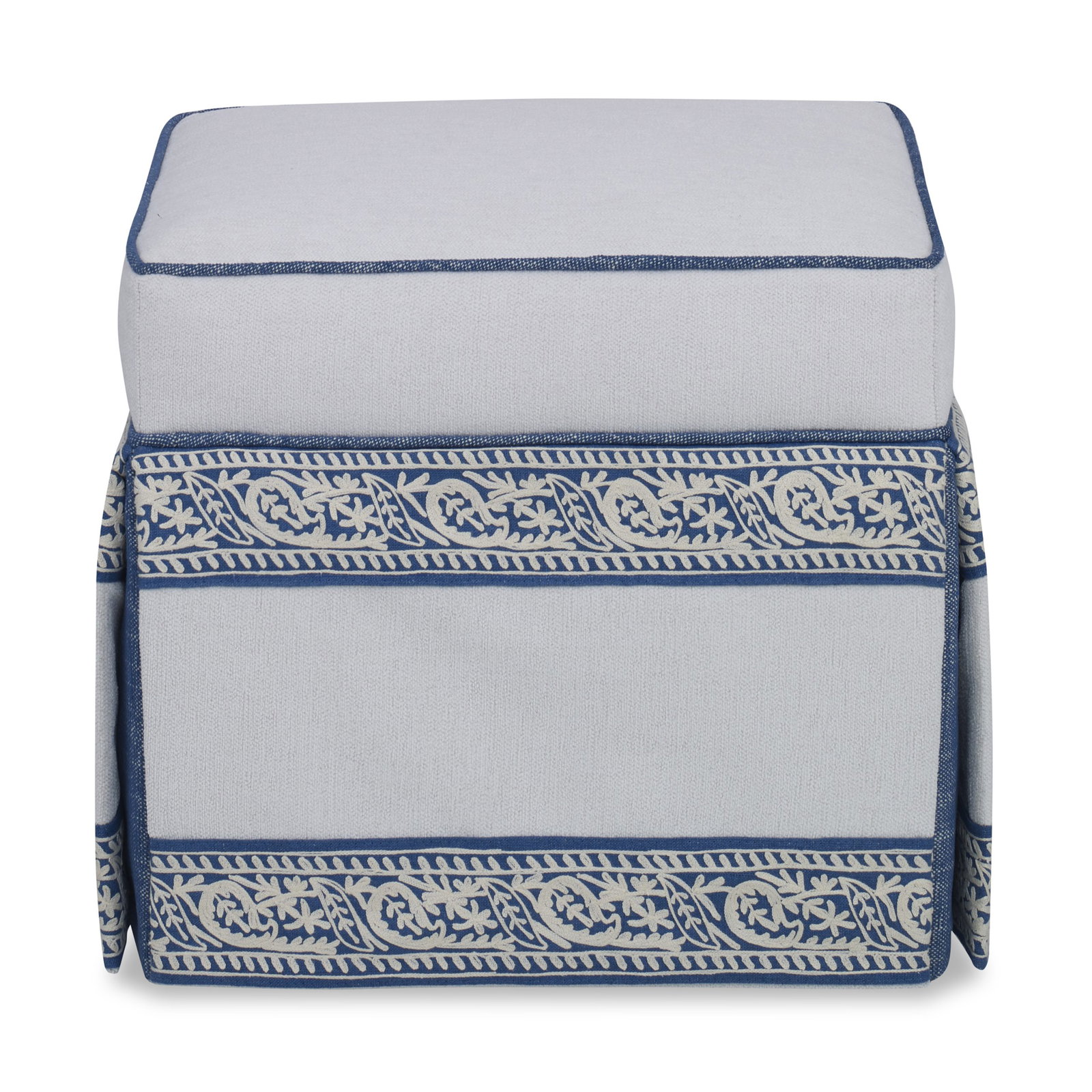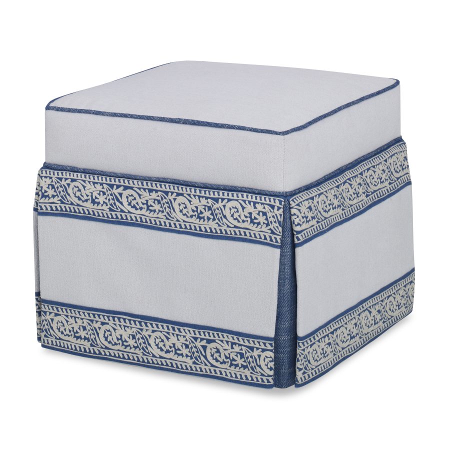 Product Description: Ambella Home 143-00 Aria Ottoman - A small scale ottoman featuring a square welted and bordered cushion atop a long kick pleat skirt.