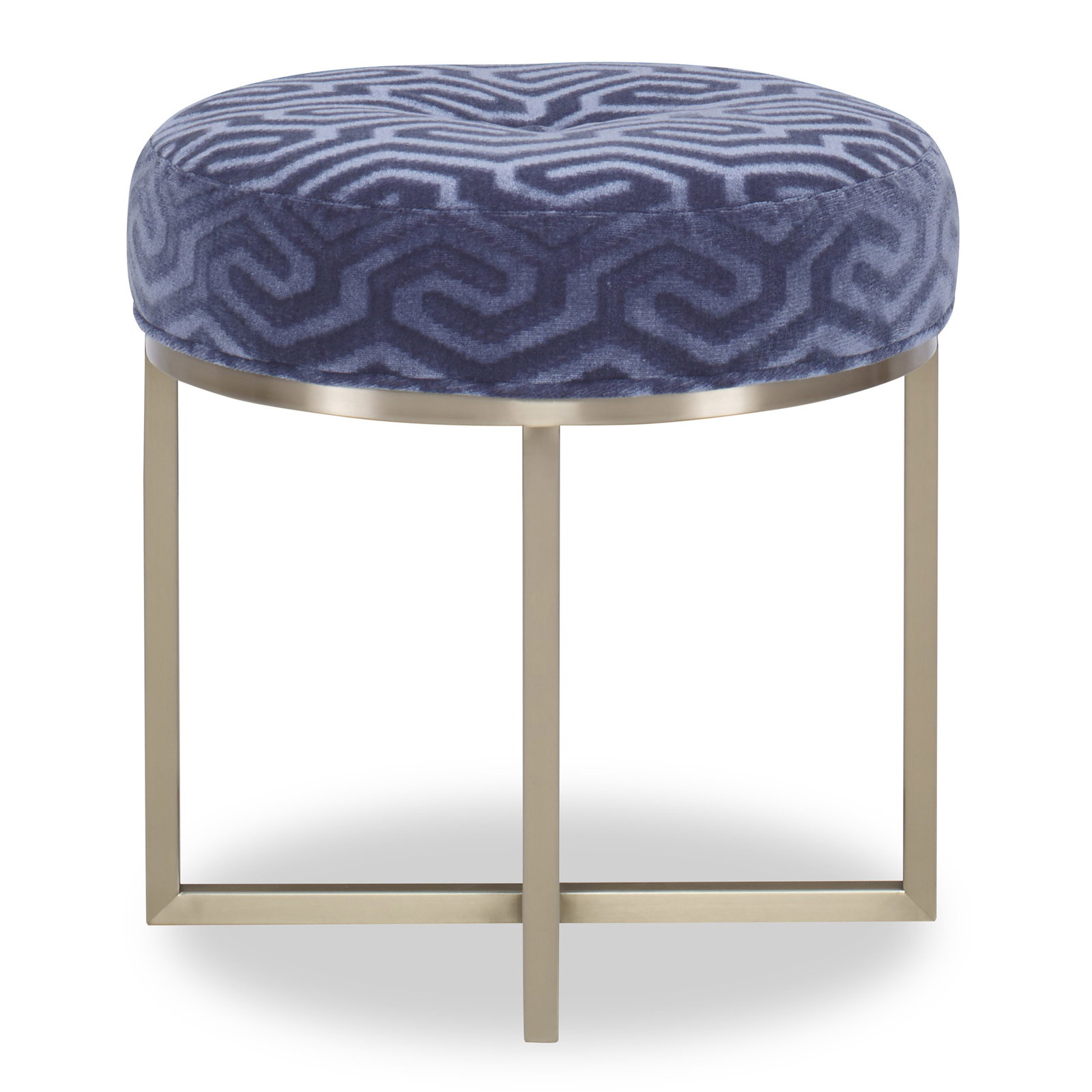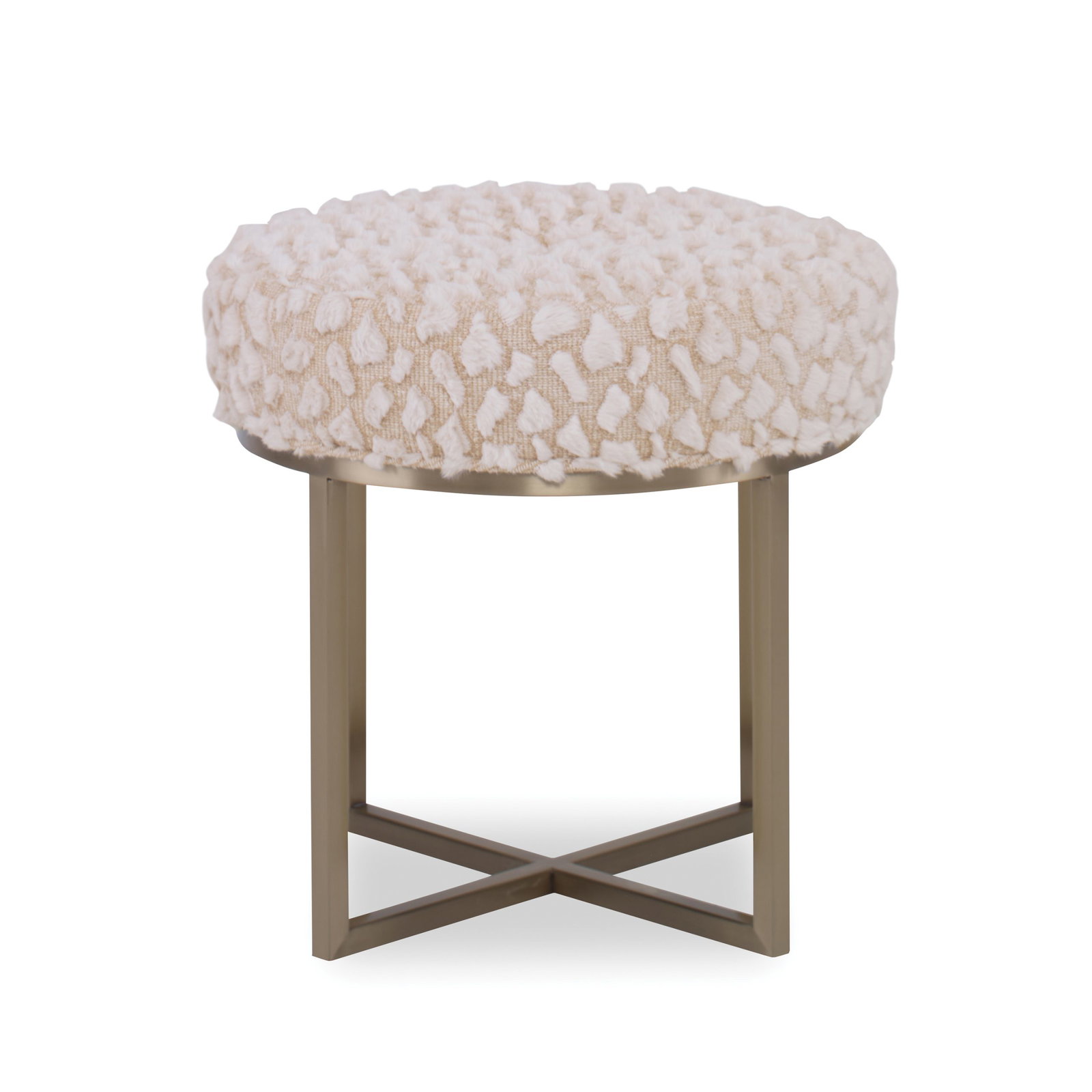 Product Description: Ambella Home 171-00 Penny Ottoman - Perfect in pairs, this petite round ottoman includes a boxed and buttoned seat cushion attached to a satin brass finished metal frame with X stretchers.