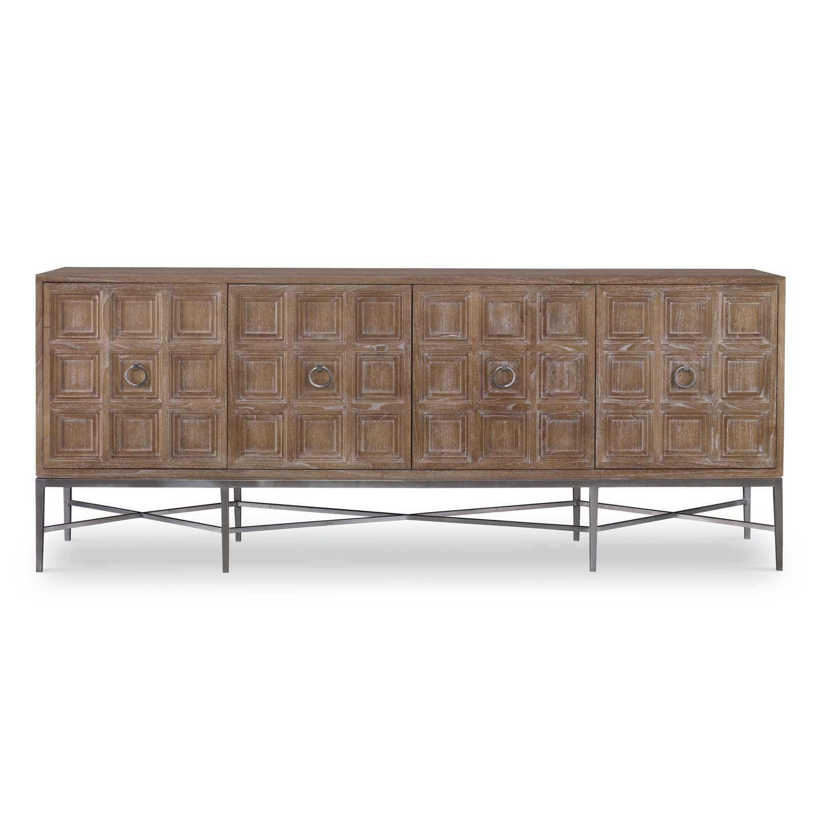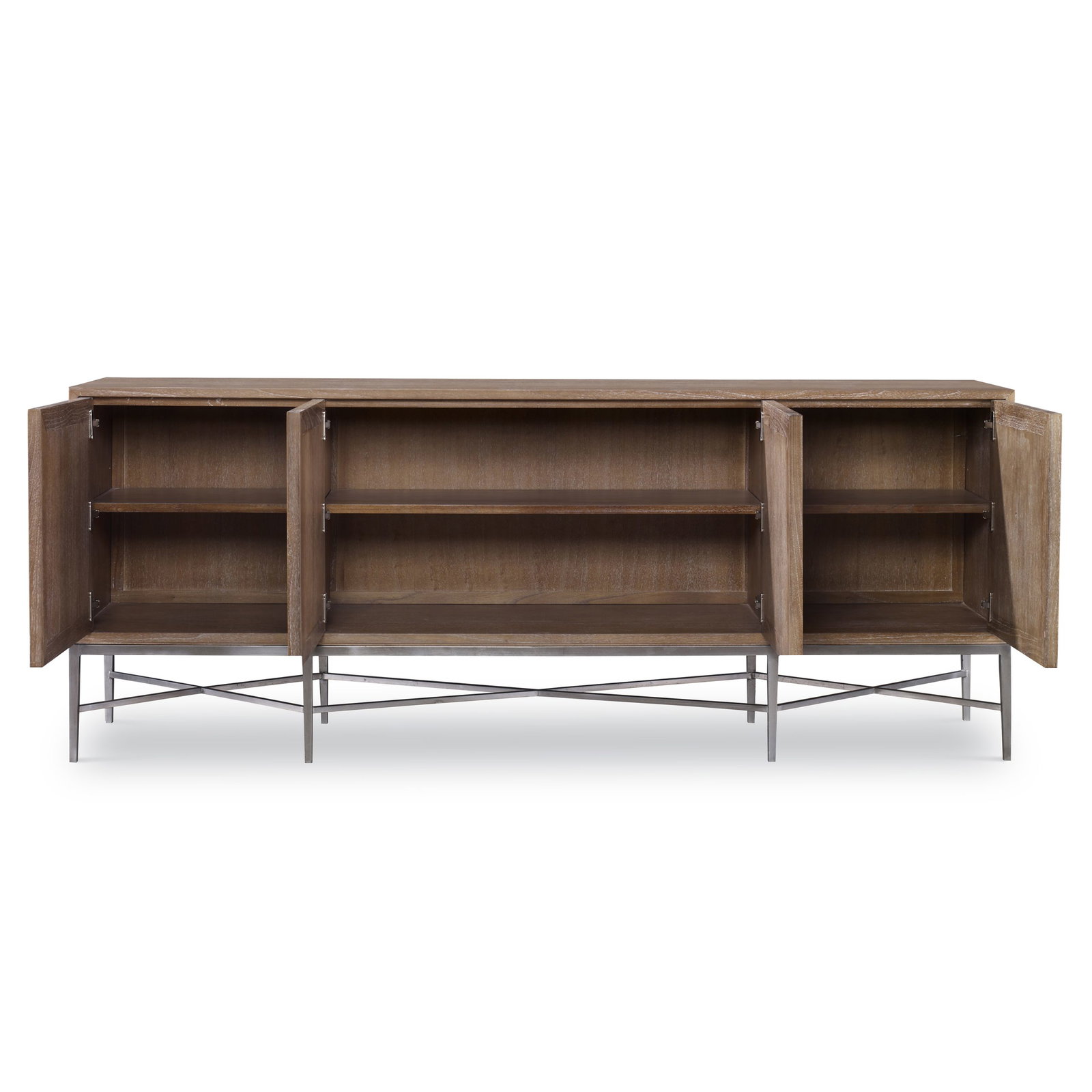 Product Description: Ambella Home 17574-820-001 Tiered 4 Door Multi-Use Cabinet - Wire brushed American White Oak cabinet features a driftwood ceruse finish. Decorative hardware and base are made of stainless steel. Four doors open to one adjustable shelf.