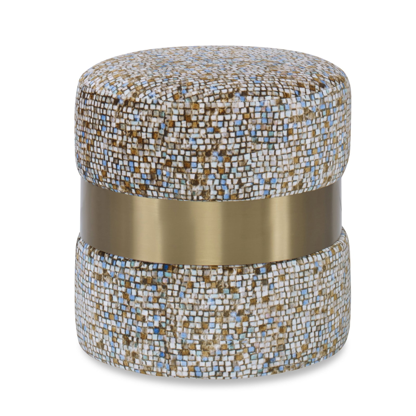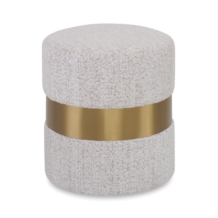 Product Description: Ambella Home 178-00 Stacked Ottoman - This cylinder shaped ottoman features a brass ring suspended in the middle. Nylon glides on base.
