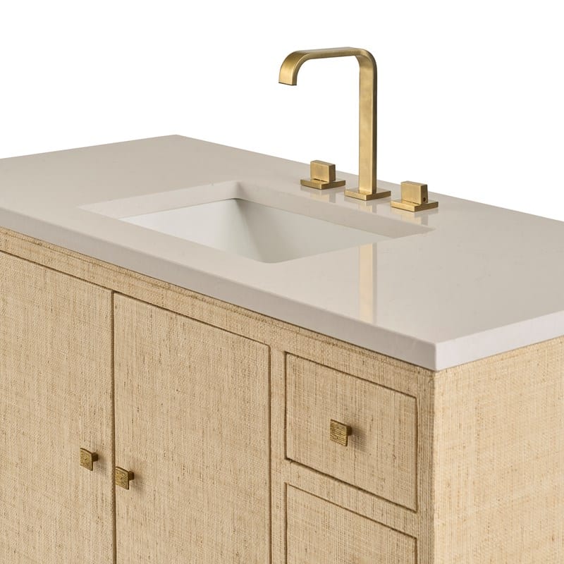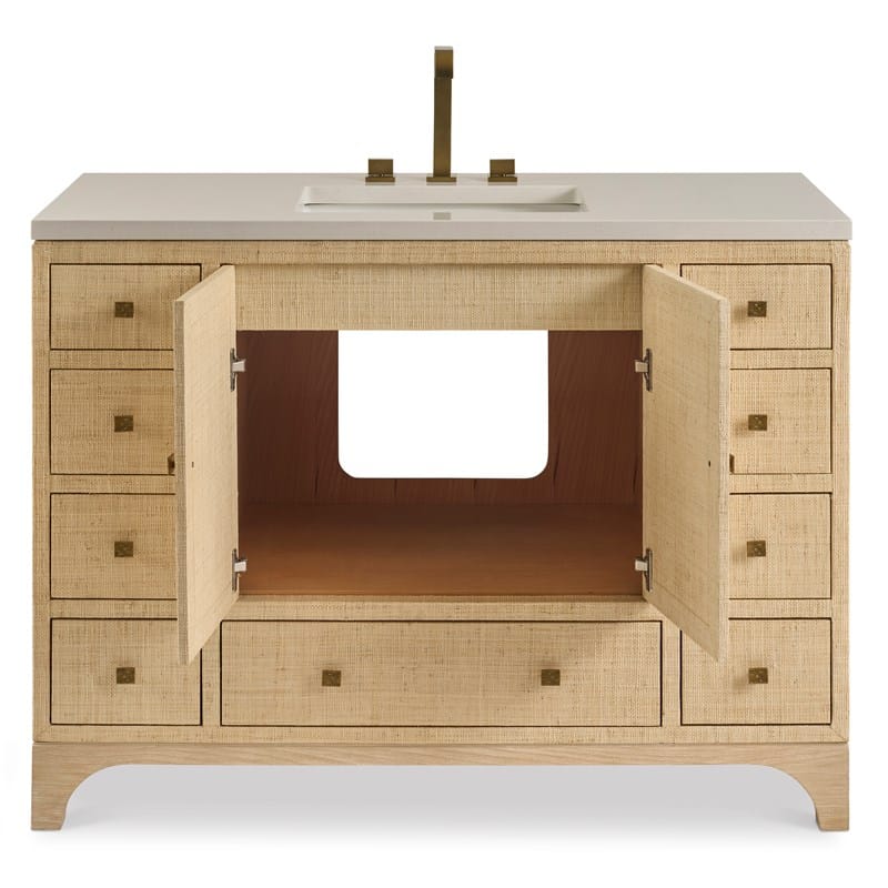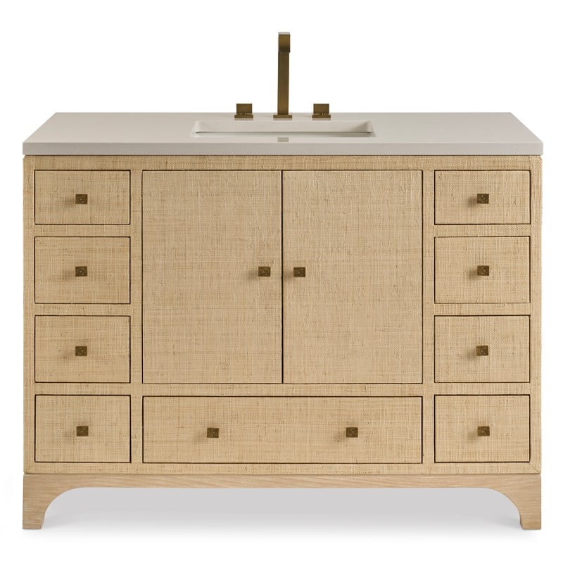 Product Description: Ambella Home 18101-110-401 Bixby Large Sink Chest - Nine drawers and a cabinet with two doors create tons of storage in this sink chest. Wrapped in natural colored raffia, the piece is topped with a white quartz top and white porcelain sink bowl. Textured, antique brass pulls. Faucet sold separately. The vanity is also available for purchase without the top.