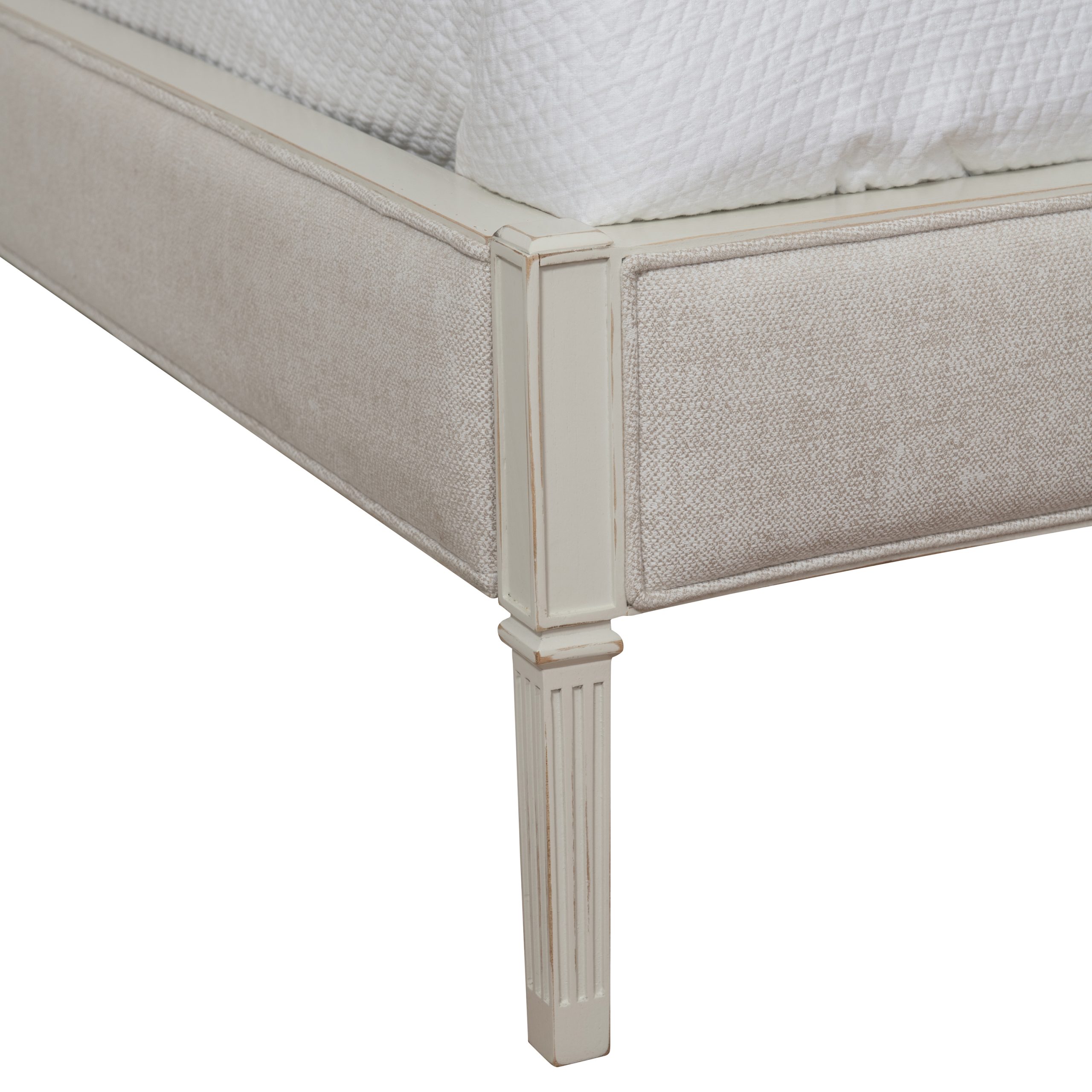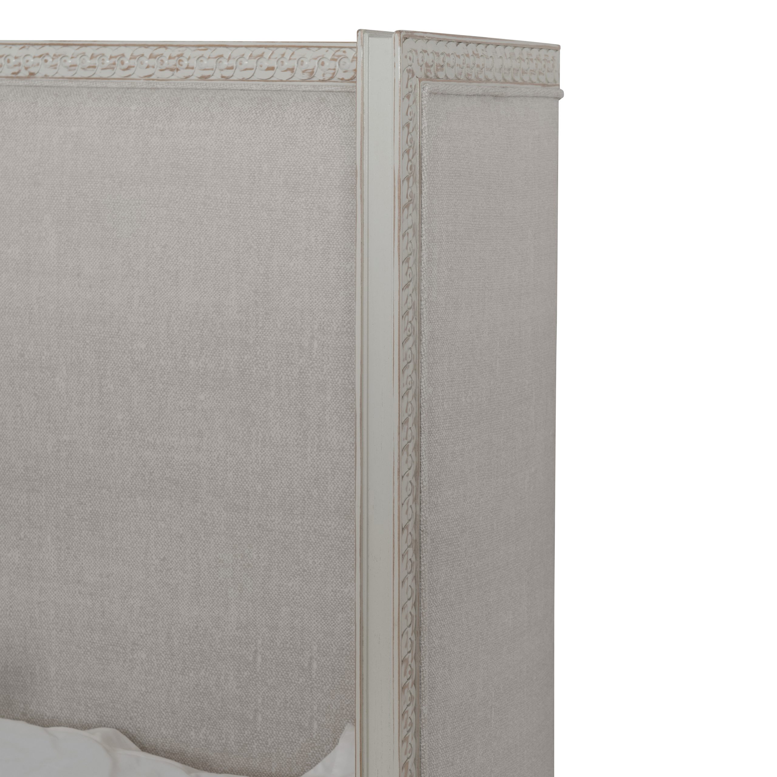 Product Description: Ambella Home 24121-200 Margaux King Bed - This Louis XVI inspired bed includes a winged tall headboard and upholstered side and foot rails all raised on carved, fluted feet. A circilo motif is carved around the headboard and wings. Available in any Ambella fabric or COM.