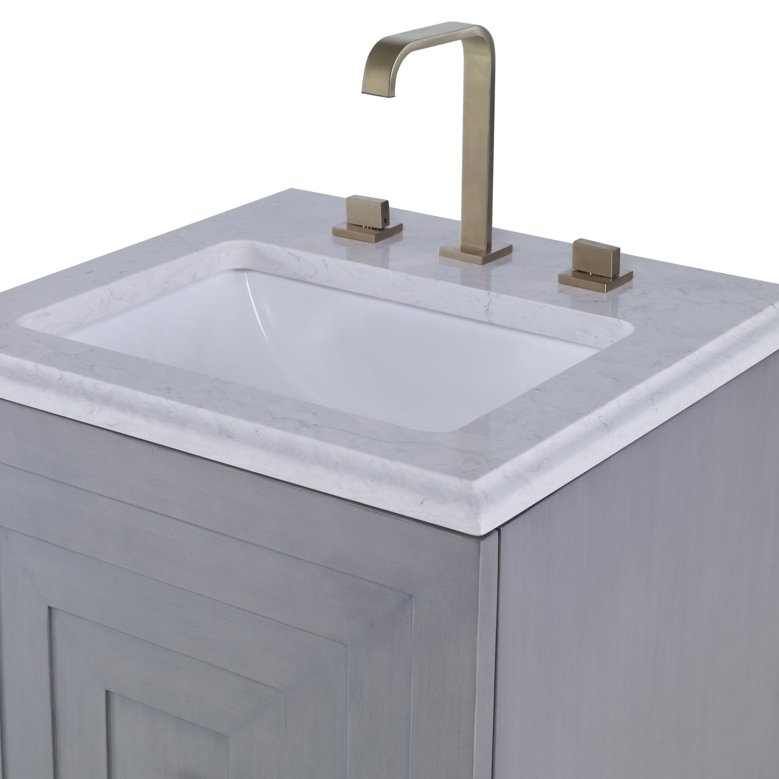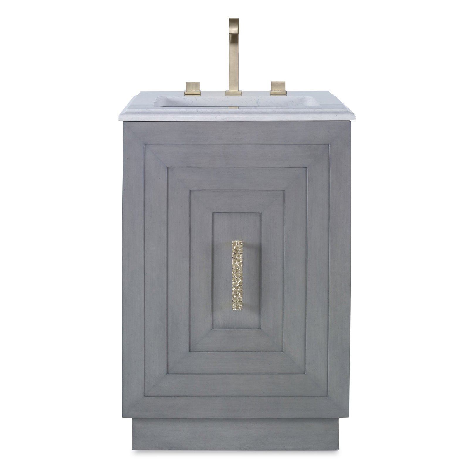 Product Description: Ambella Home 24129-110-101 Veronica Petite Sink Chest - This sink chest includes one door with concentric rectangles covering the front. Centered on the door is a textured, antique brass, bar pull. Two small shelves are included. The silhouette is completed with a quartz top and white porcelain sink bowl. The vanity is also available for purchase without the top.