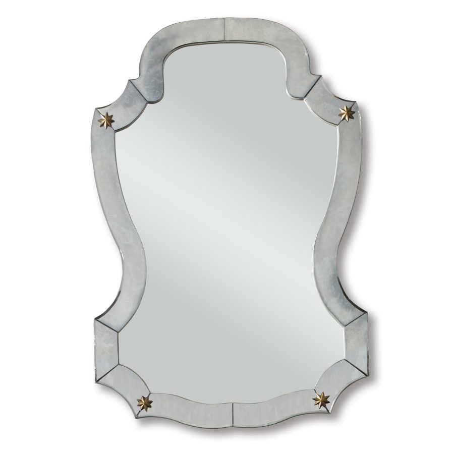 Product Description: Ambella Home 27087-140-040 Leona Mirror - A silver leaf frame surrounds a clear mirror center with antique mirror panels accented with solid brass stars. Hangs on incuded metal cleat.