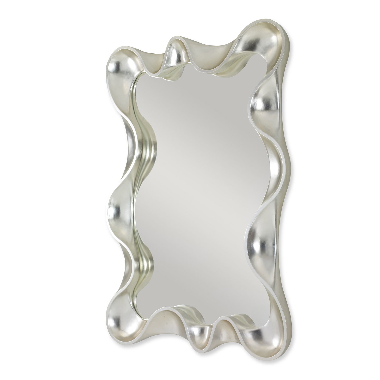 Product Description: Ambella Home 27113-980-040 Scalloped Mirror Silver - This overscaled mirror features a clear glass mirror surrounded by a rippling and undulating sculpted silver leaf frame. Includes a metal cleat for easy installation. Hangs vertically or horizontally.