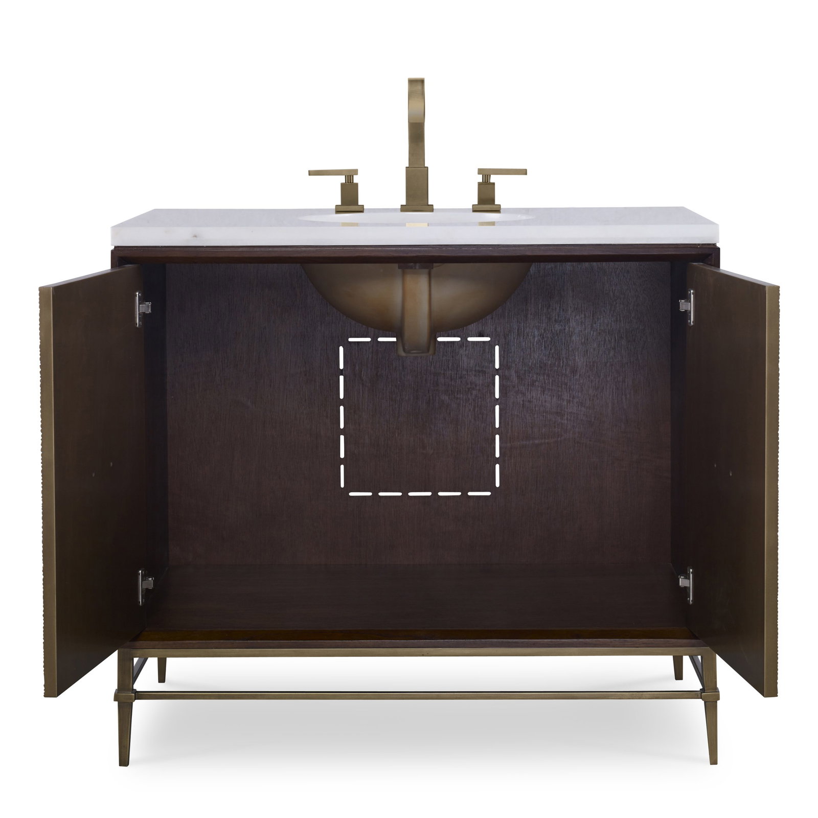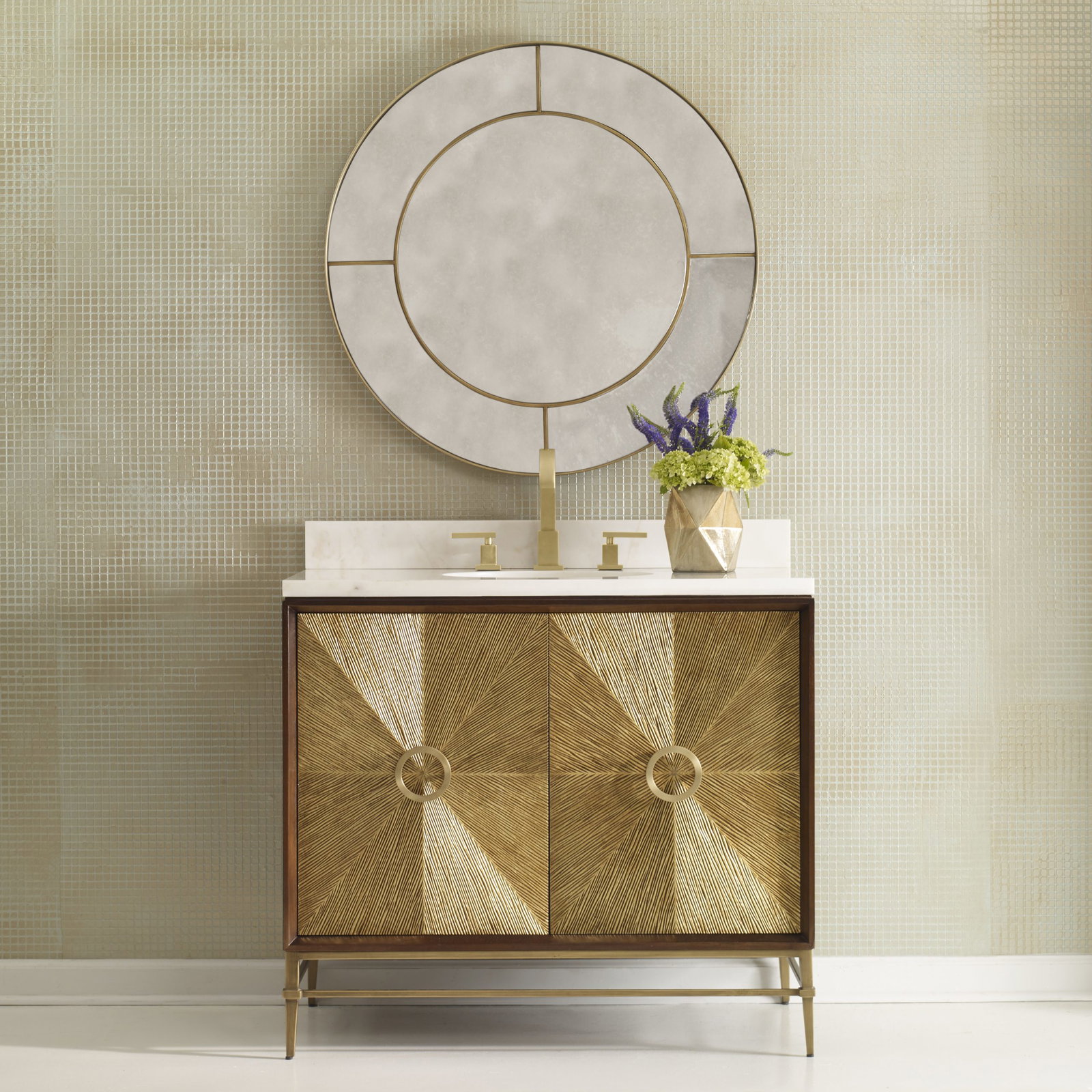 Product Description: Ambella Home 27118-110-401 Phoenix Sink Chest - Crafted of Mahogany solids and veneers, this sink chest features metal doors with a sunburst relief pattern in an antique brass finish. Circular brass pulls are mounted in the center of the sunburst. A metal base in an antique brass finish completes the look. The top is made of Primavera white marble with an undermounted porcelain sink. Faucet shown is no longer available.