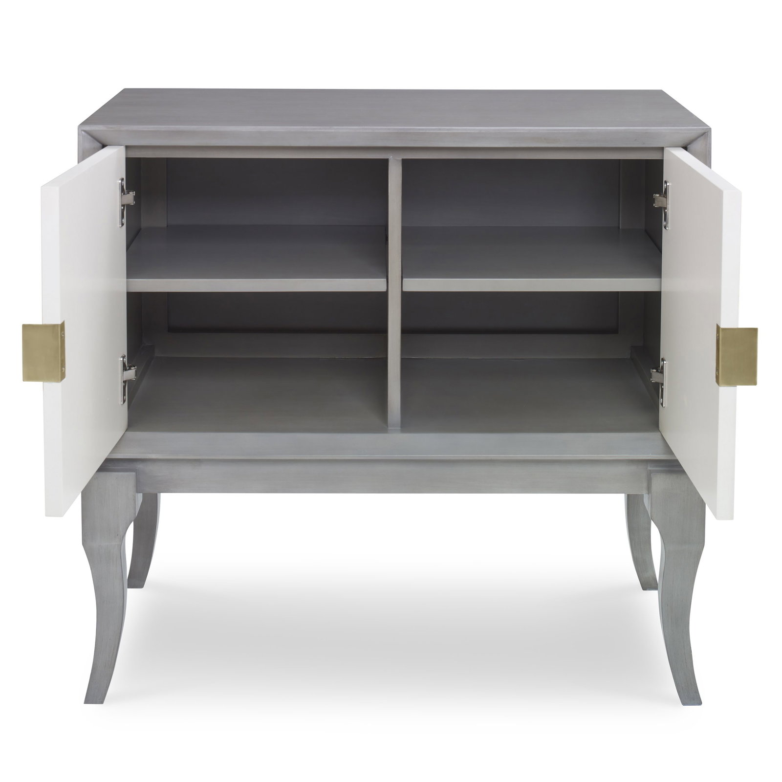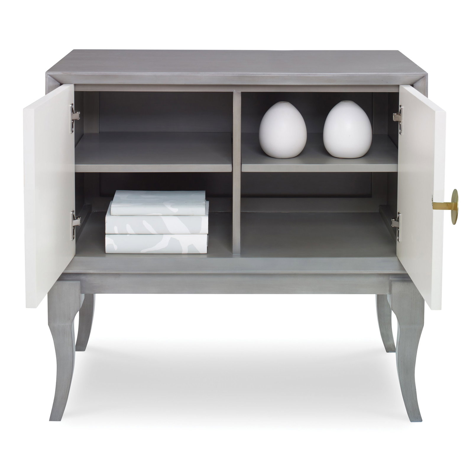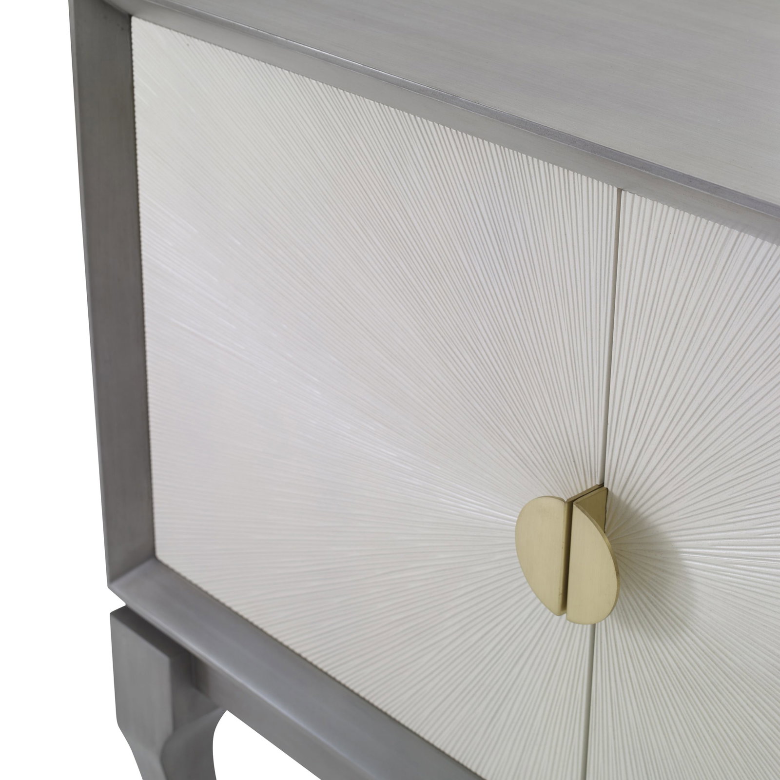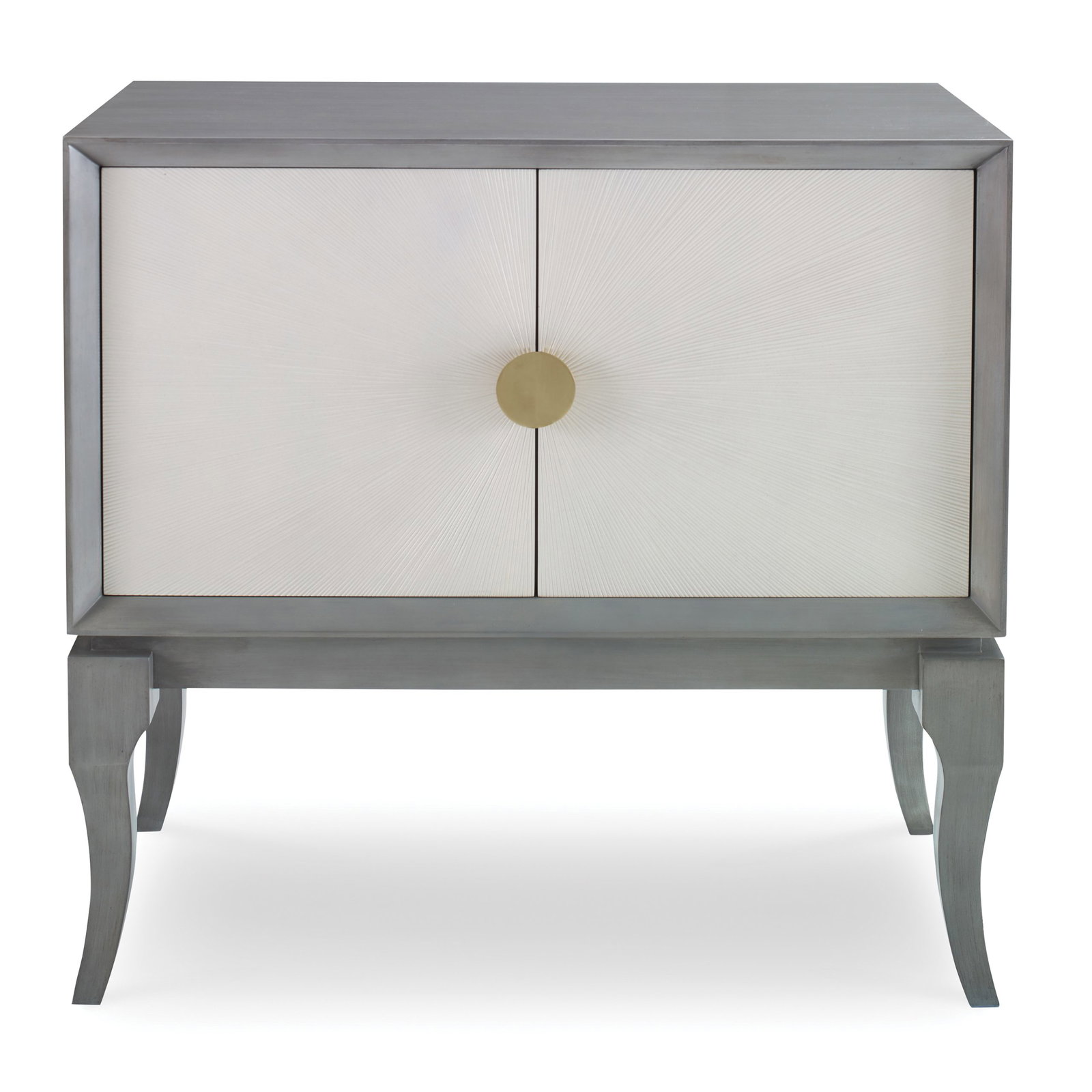Product Description: Ambella Home 27152-820-002 Avondale Cabinet Grey / Linen - This Mahogany cabinet includes a carved sunburst pattern on its two doors. The linen doors contrast wth the ash grey case. Raised on stylized cabriole legs, the cabinet includes one shelf and brass hardware.