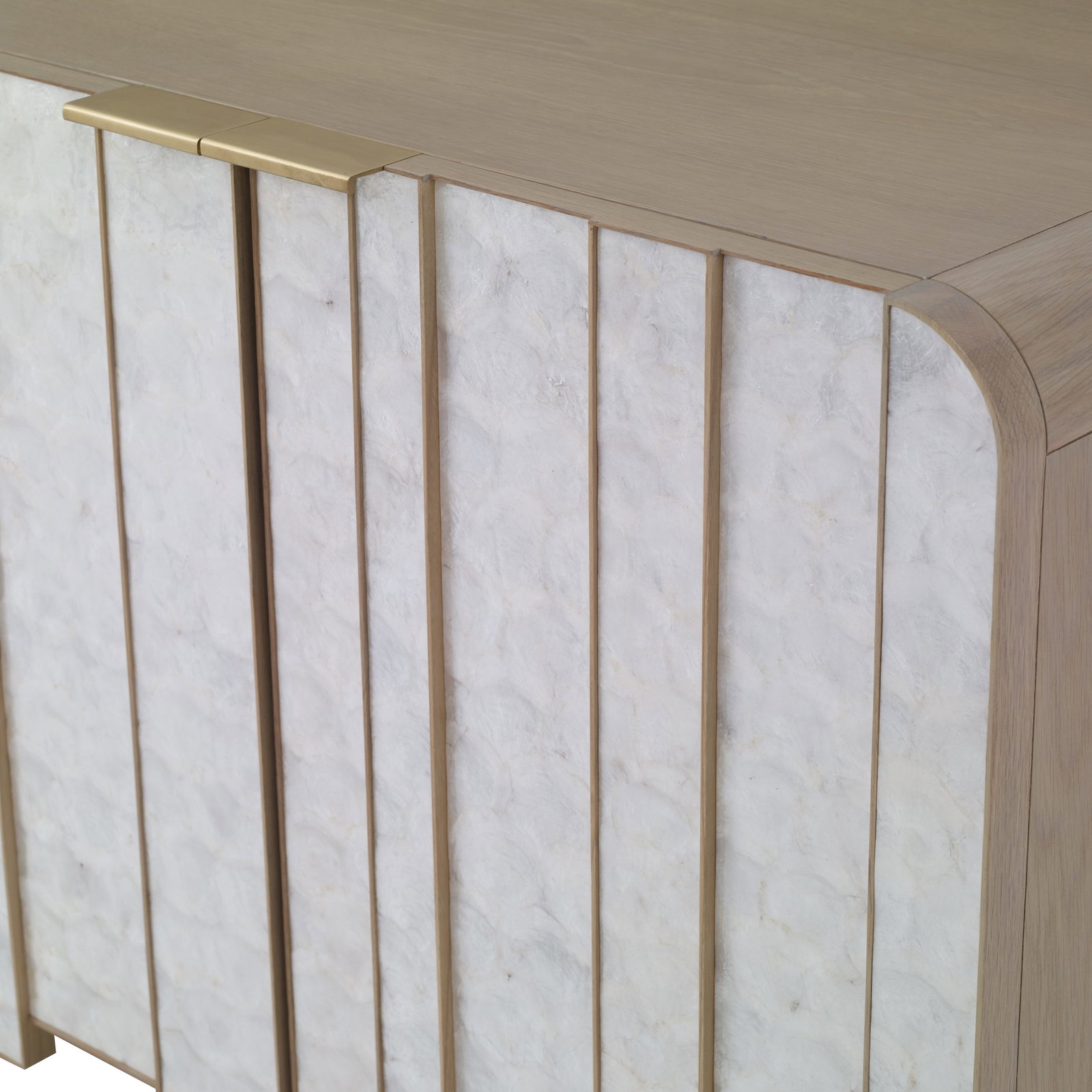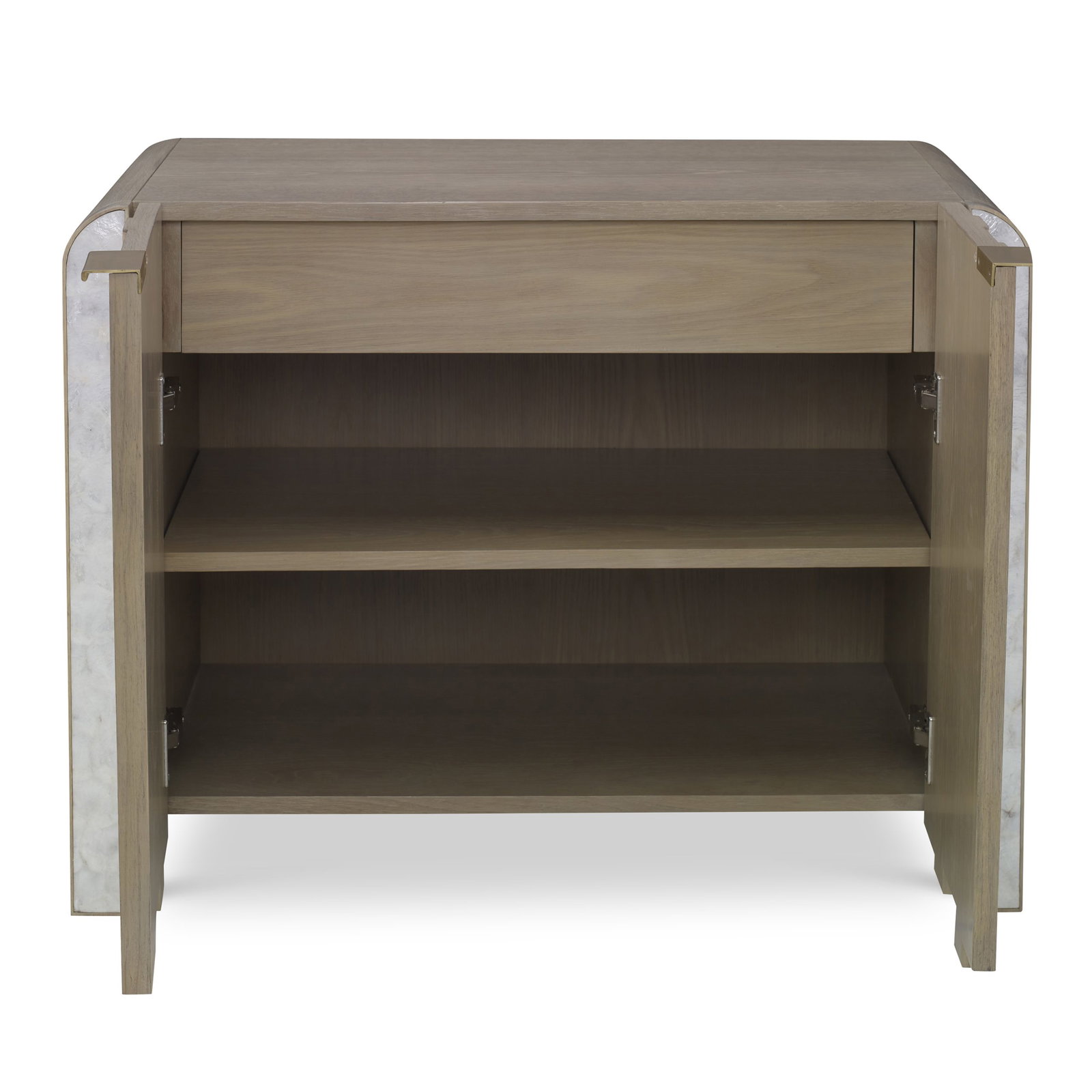 Product Description: Ambella Home 27171-230-001 Griffith Bedside Table - Designed By Erinn V, this Deco inspired nightstand features two wood framed doors with Capiz shell inlay. One interior drawer and one adjustable shelf is included.