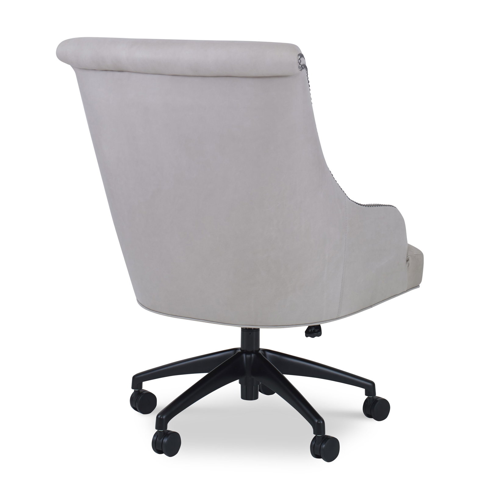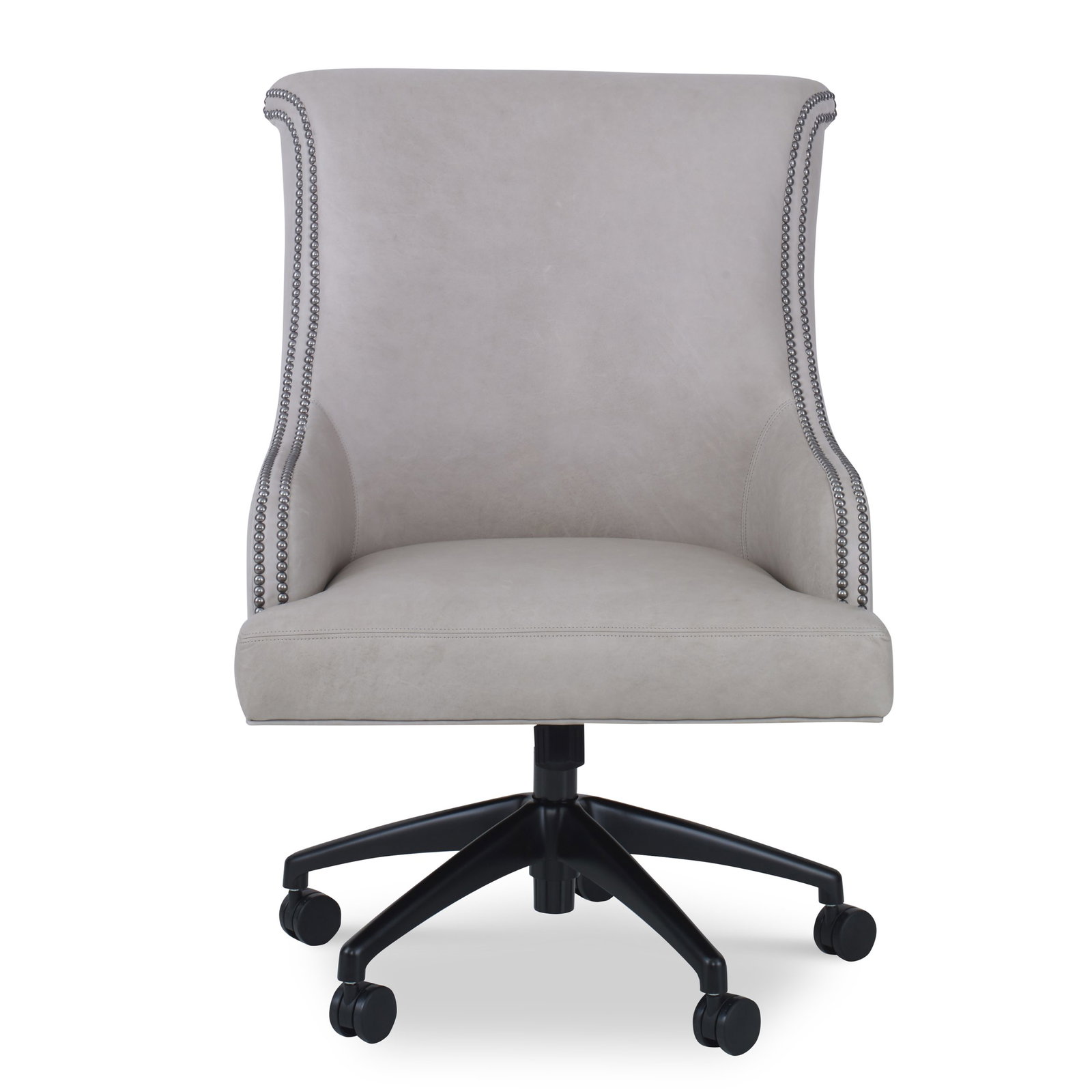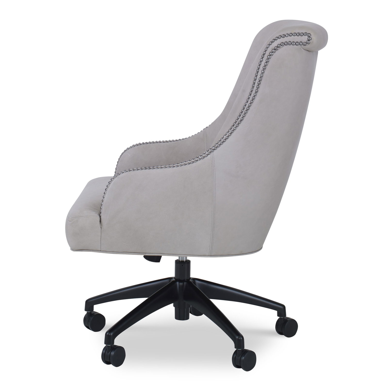 Product Description: Ambella Home 580-48 Julian Desk Chair - This desk chair features fully upholstered low curving arms with decorative nailheads and a rolled back raised over a tight seat. The base is a high performance five prong design crafted from die cast aluminum in a powder coated matt black finish. Contract grade castors are black, hooded and twin wheeled. The chair mechanism is a gas cylinder lift with a push/pull/tilt mechanism and tension adjustment.