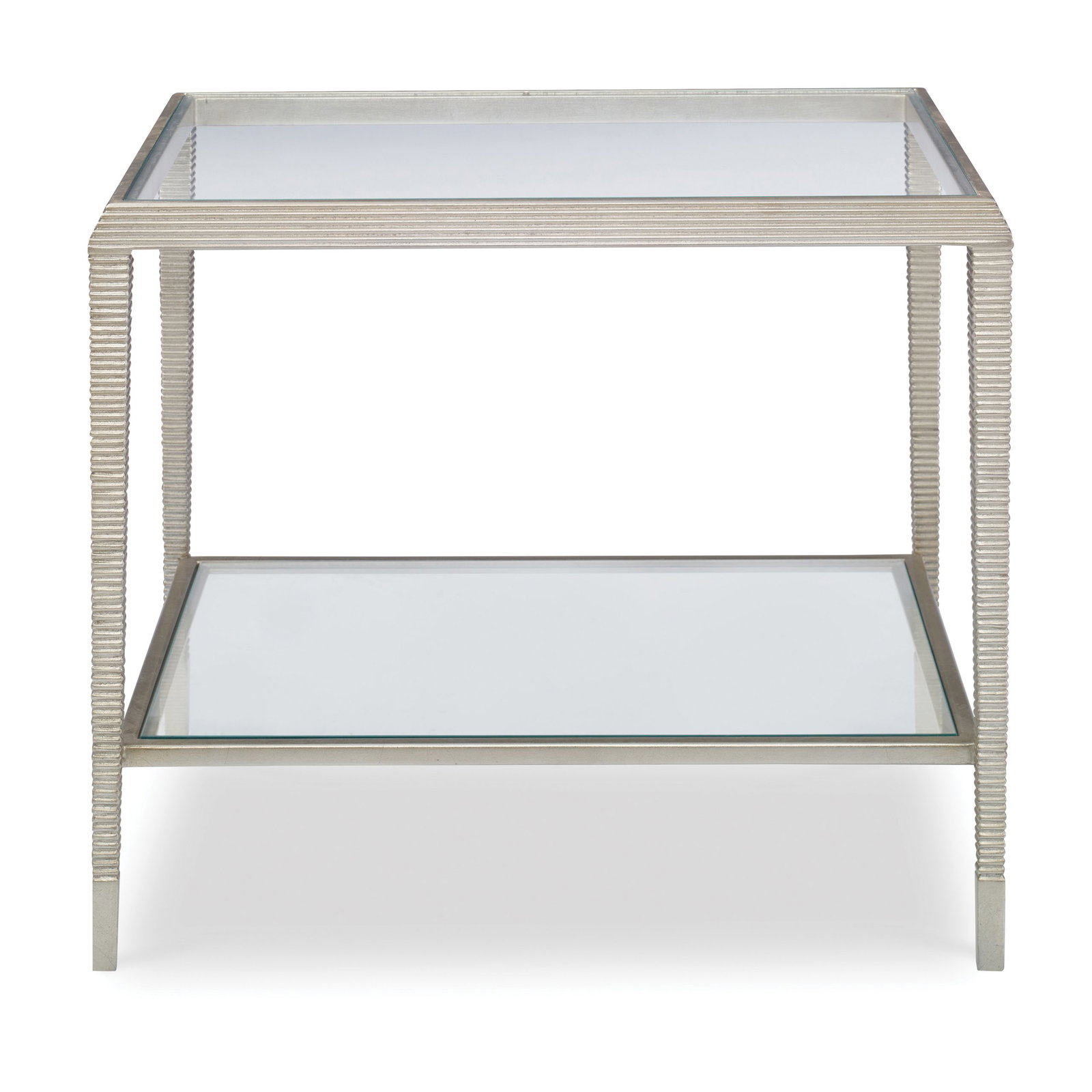 Product Description: Ambella Home 65031-900-001 Sumter Side Table - A champagne leaf frame supports a tempered, clear glass top and shelf on this end table. The leafed finish is complemented with a ribbed texture on the frame. Designed by Shayla Copas.