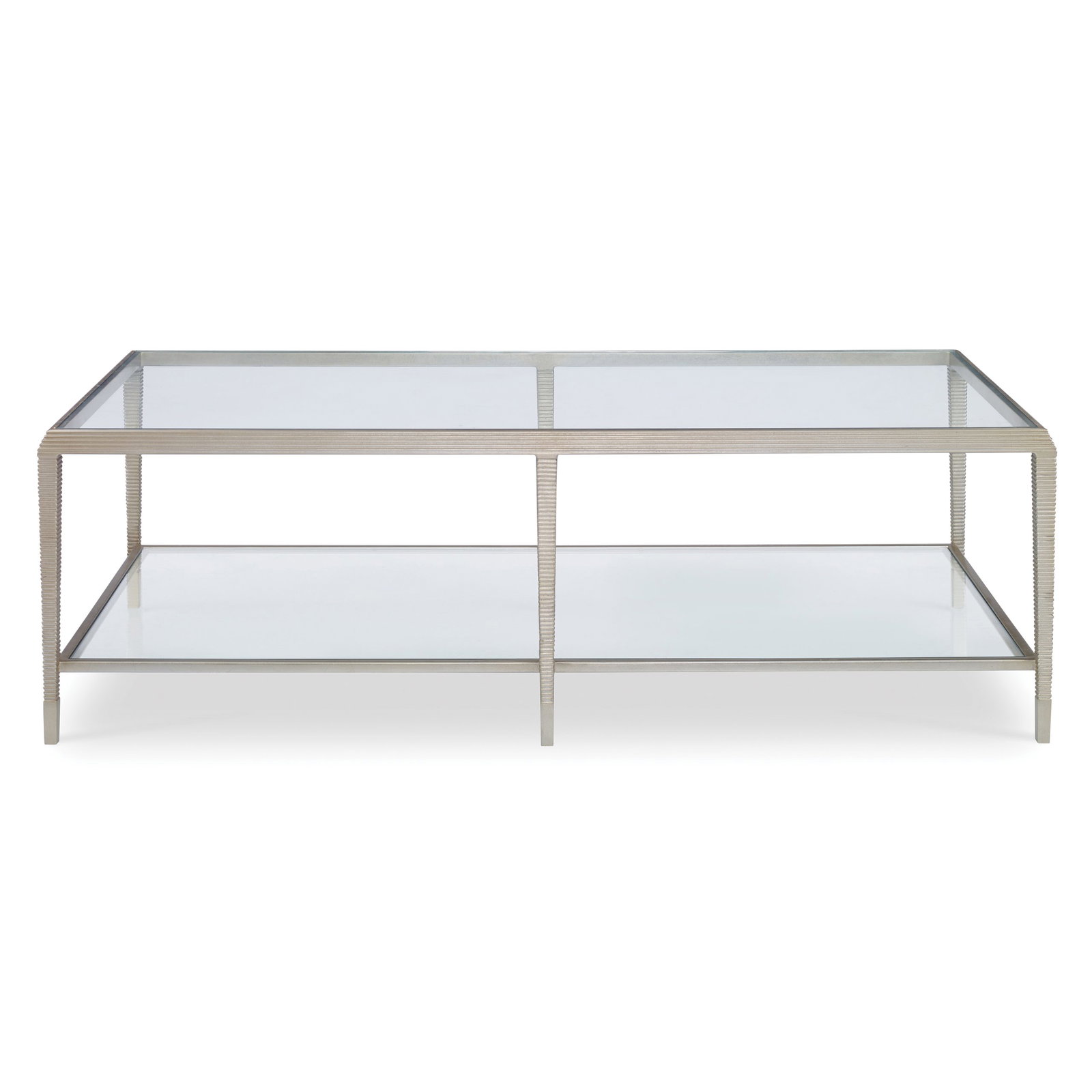 Product Description: Ambella Home 65031-920-001 Sumter Cocktail Table - A champagne leaf frame supports a tempered, clear glass top and shelf on this cocktail table. The leafed finish is complemented with a ribbed texture on the frame. Designed by Shayla Copas.