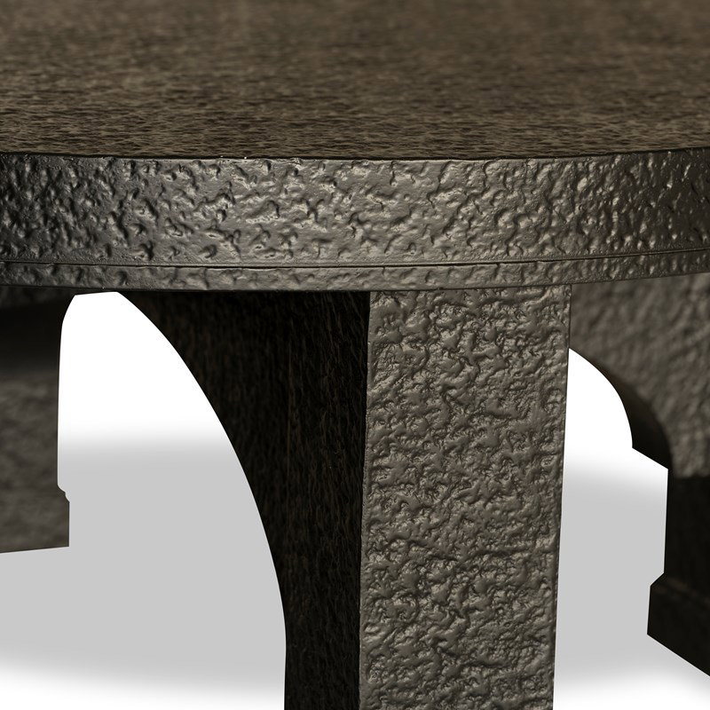 Product Description: Ambella Home 65033-920-001 Sierra Cocktail Table - This black metal cocktail table includes a hand forged texture on architectural legs and a round top.